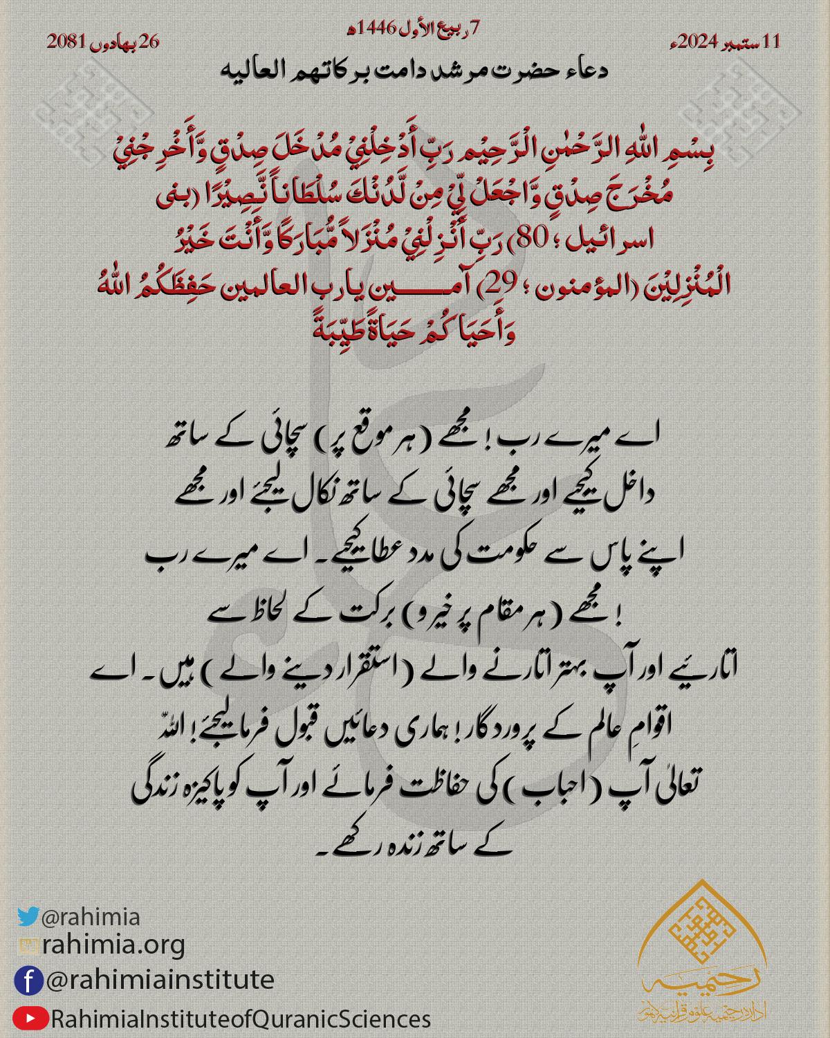بِسْمِ اللّٰهِ الرَّحْمٰنِ الْرَّحِيْم رَبِّ أَدْخِلْنِيْ مُدْخَلَ صِدْقٍ وَّأَخْرِجْنِيْ مُخْرَجَ صِدْقٍ وَّاجْعَلْ لِّيْ مِنْ لَّدُنْكَ سُلْطَاناً نَّصِيْرًا (بنی اسرائیل ؛ 80) رَبِّ أَنْزِلْنِيْ مُنْزَل…