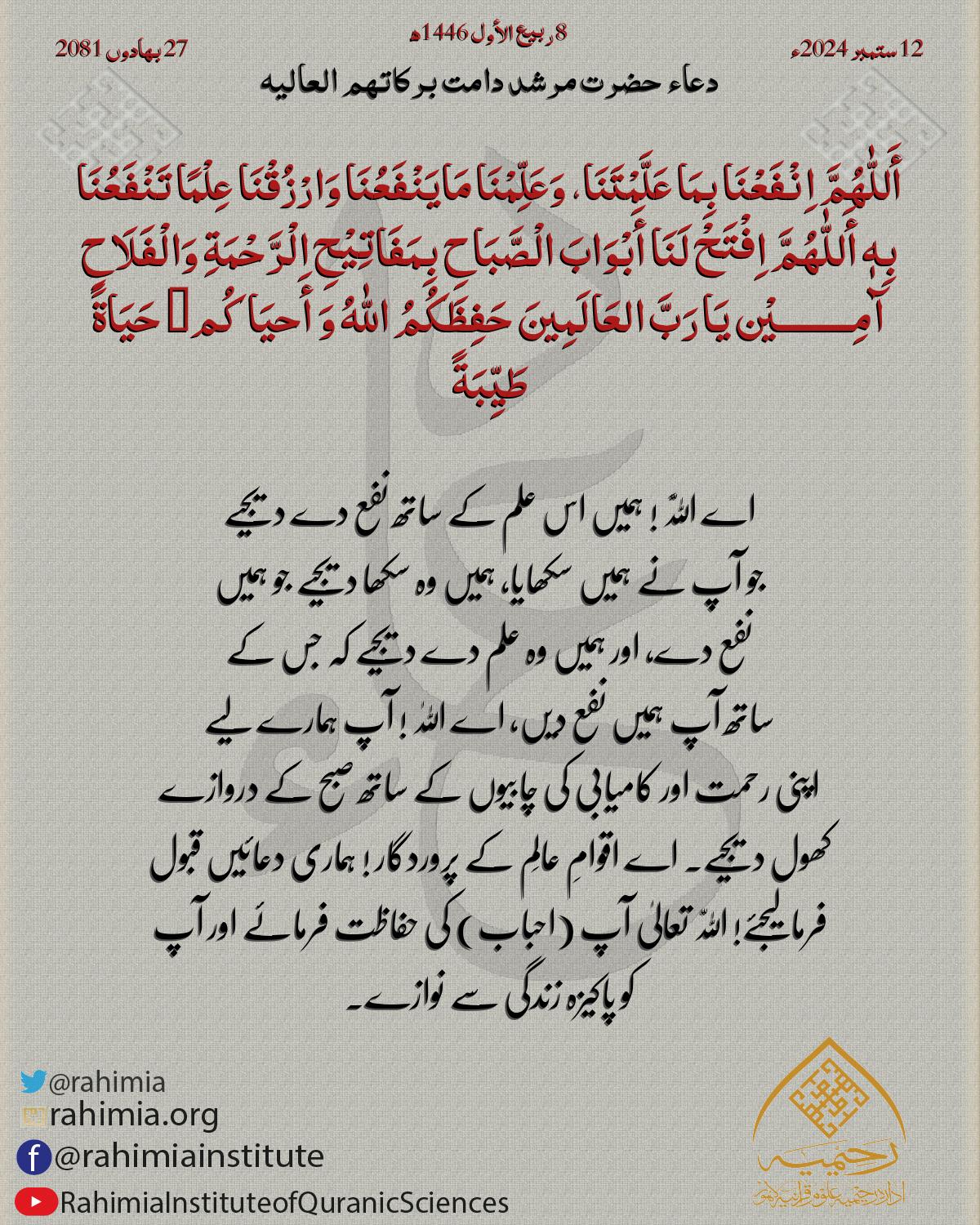 أَللّٰھُمَّ اِنْفَعْنَا بِمَا عَلَّمْتَنَا، وَعَلِّمْنَا مَایَنْفَعُنَا وَارْزُقْنَا عِلْمًا تَنْفَعُنَا بِهٖ أَللّٰھُمَّ اِفْتَحْ لَنَا أَبْوَابَ الْصَّبَاحِ بِمَفَاتِیْحِ الْرَّحْمَةِ وَالْفَلَاحِ آمِ…