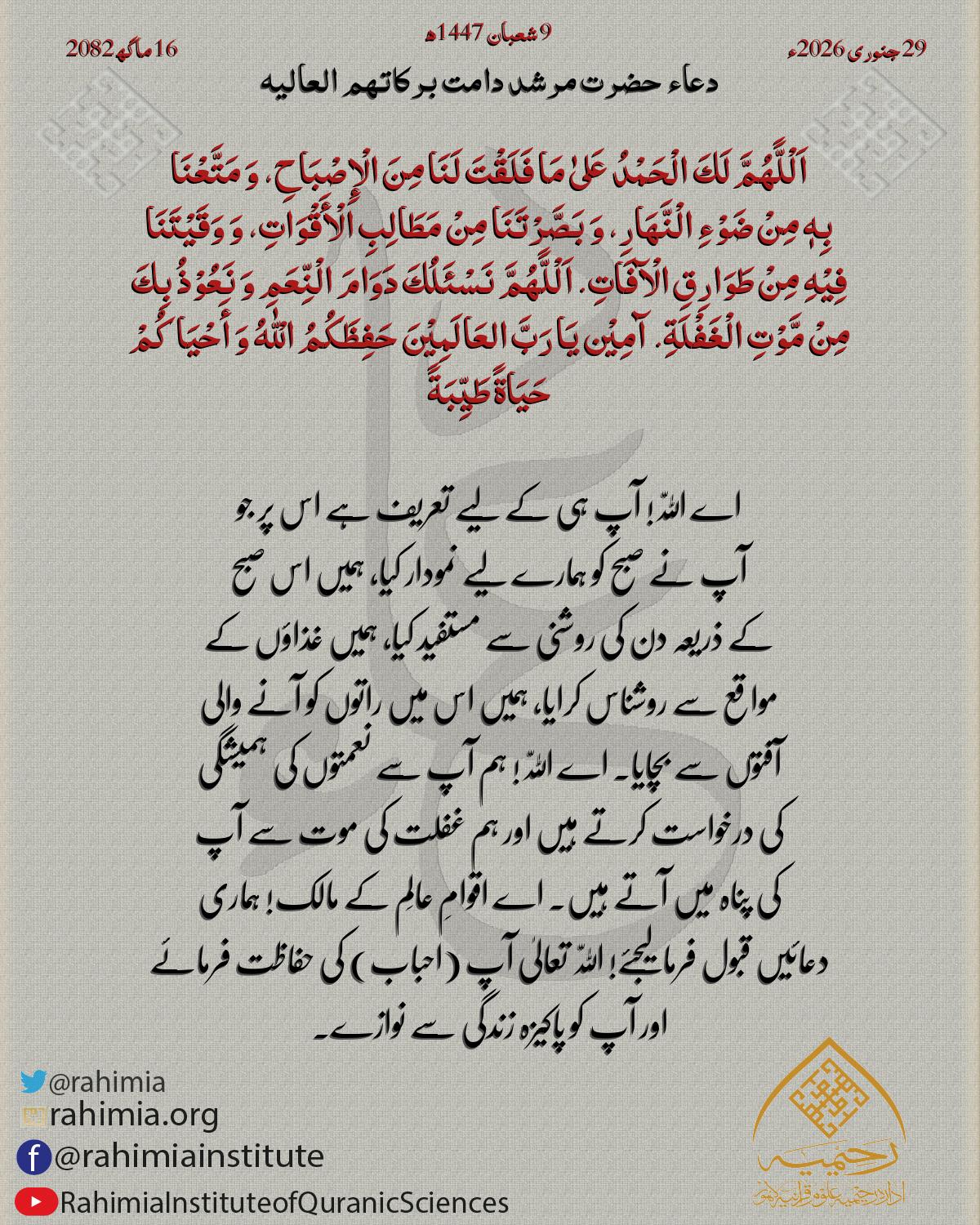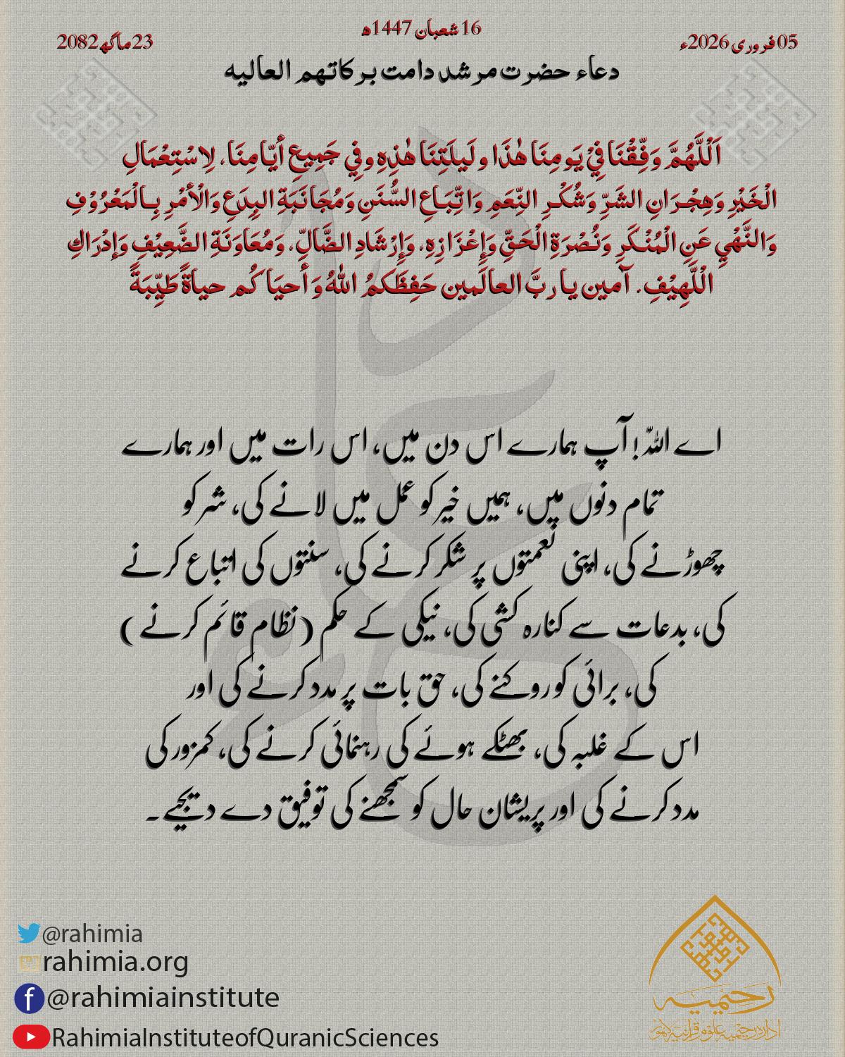 اَلْلًّهُمَّ أَسْمِعْنَا خَیْرًا، وَ أطْلِعْنَا خَیْرًا، وَارْزُقْنَا الْعَافِیَةَ وَ أَدِمْھَا لَنَا، وَ اجْمَعْ قُلُوْبَنَا عَلَی الْتَّقْویٰ، وَ وَفِّقْنَا لِمَا تُحِبُُ وَ تَرْضیٰ. اَلْلًّهُمَّ آمِنْ …