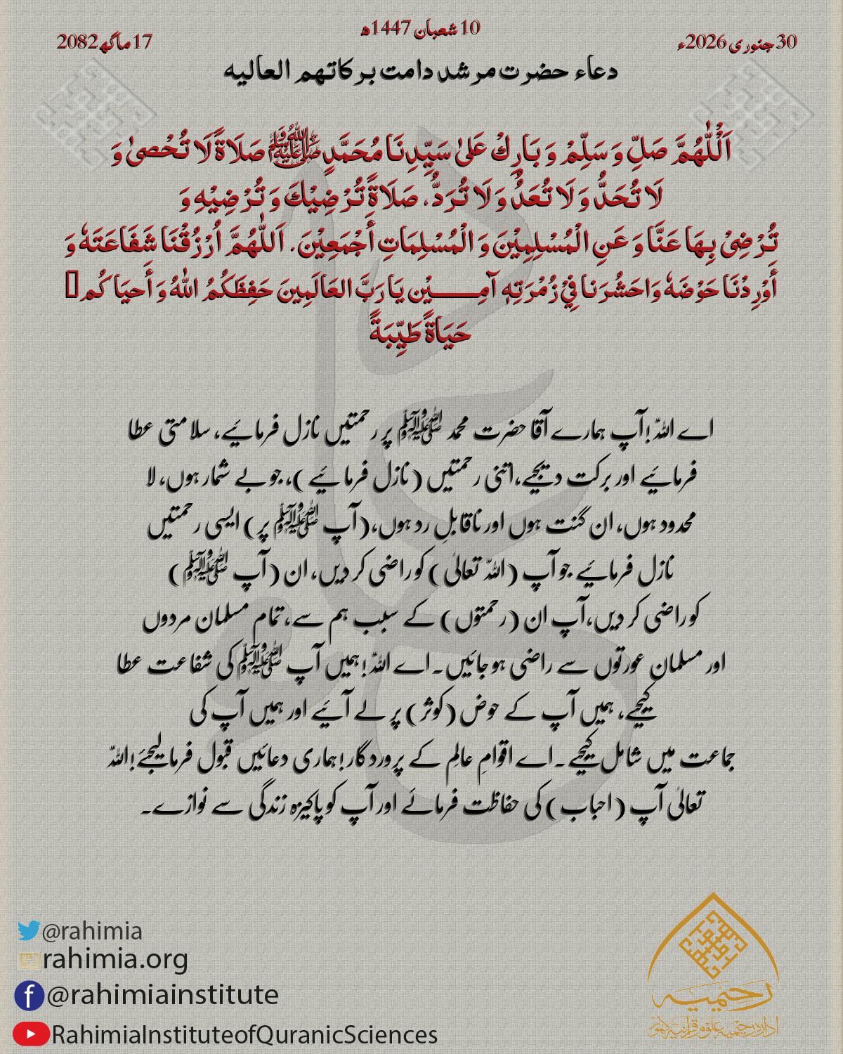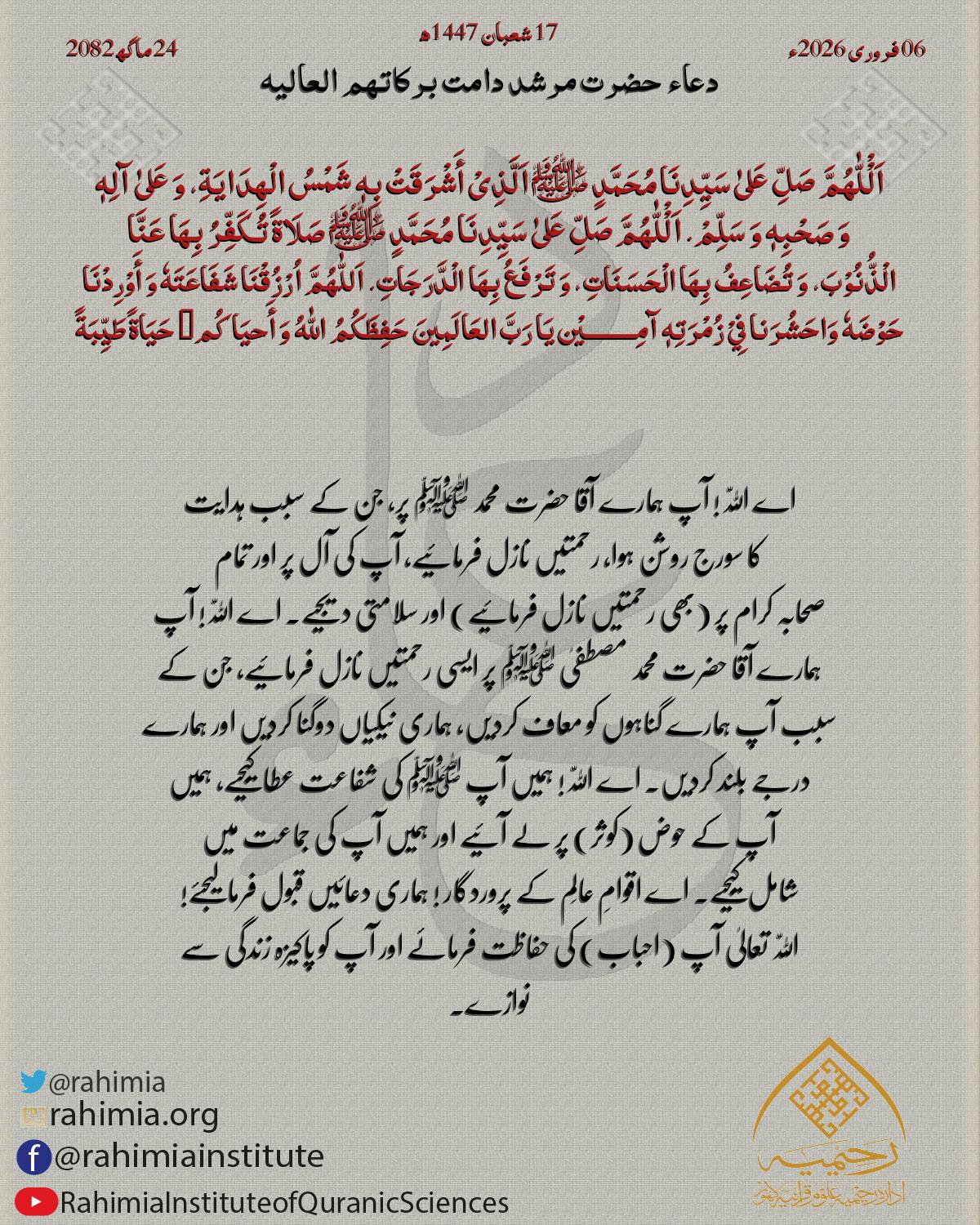 اَلْْلّٰهُمَّ صَلِّ وَ سَلِّمْ وَ بَارِكْ عَلیٰ سَیِّدِنَا مُحَمَّدٍﷺ صَلَاةً لَا تُحْصیٰ وَ لَا تُحَدُّ وَ لَا تُعَدُُ وَ لَا تُرَدُّ، صَلَاةً تُرْضِیْكَ وَ تُرْضِیْهِ وَ تُرْضِیْ بِھَا عَنَّا وَ عَنِ الْمُسْلِمِ…