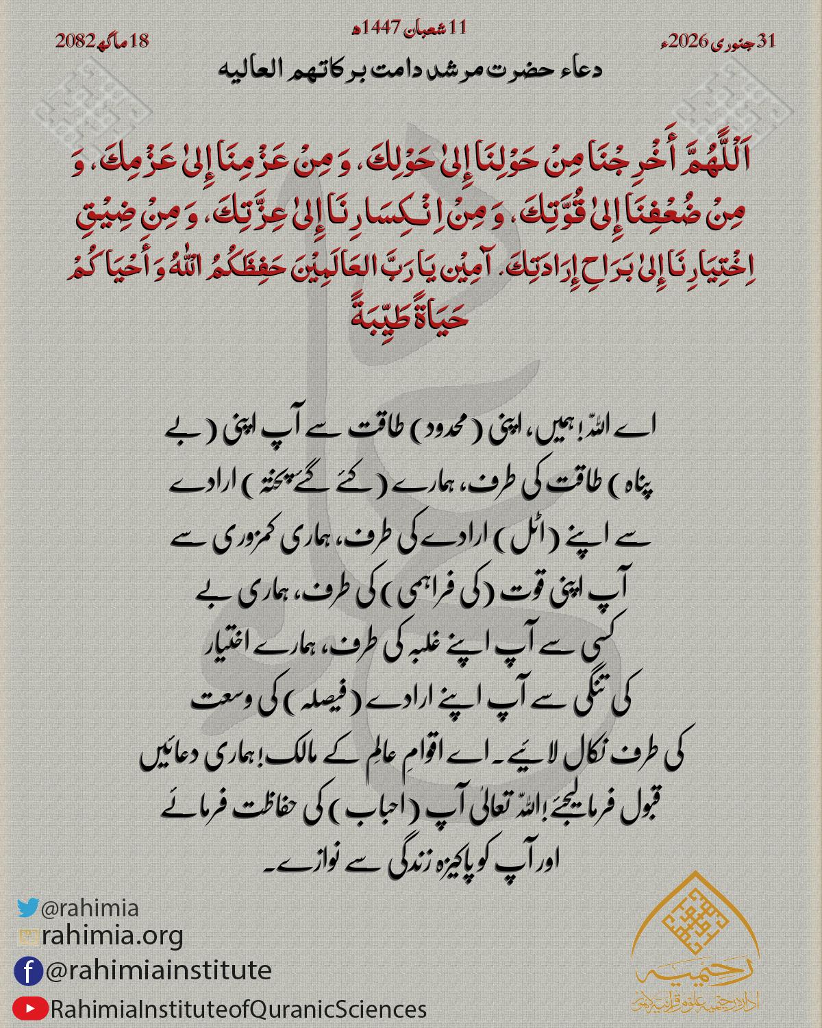 اَلْلًّهُمَّ أَخْرِجْنَا مِنْ حَوْلِنَا إِلیٰ حَوْلِكَ، وَ مِنْ عَزْمِنَا إِلیٰ عَزْمِكَ، وَ مِنْ ضُعْفِنَا إِلیٰ قُوَّتِكَ، وَ مِنْ اِنْکِسَارِنَا إِلیٰ عِزَّتِكَ، وَ مِنْ ضِیْقِ اِخْتِیَارِنَا إِلیٰ بَرَاحِ إِرَ…