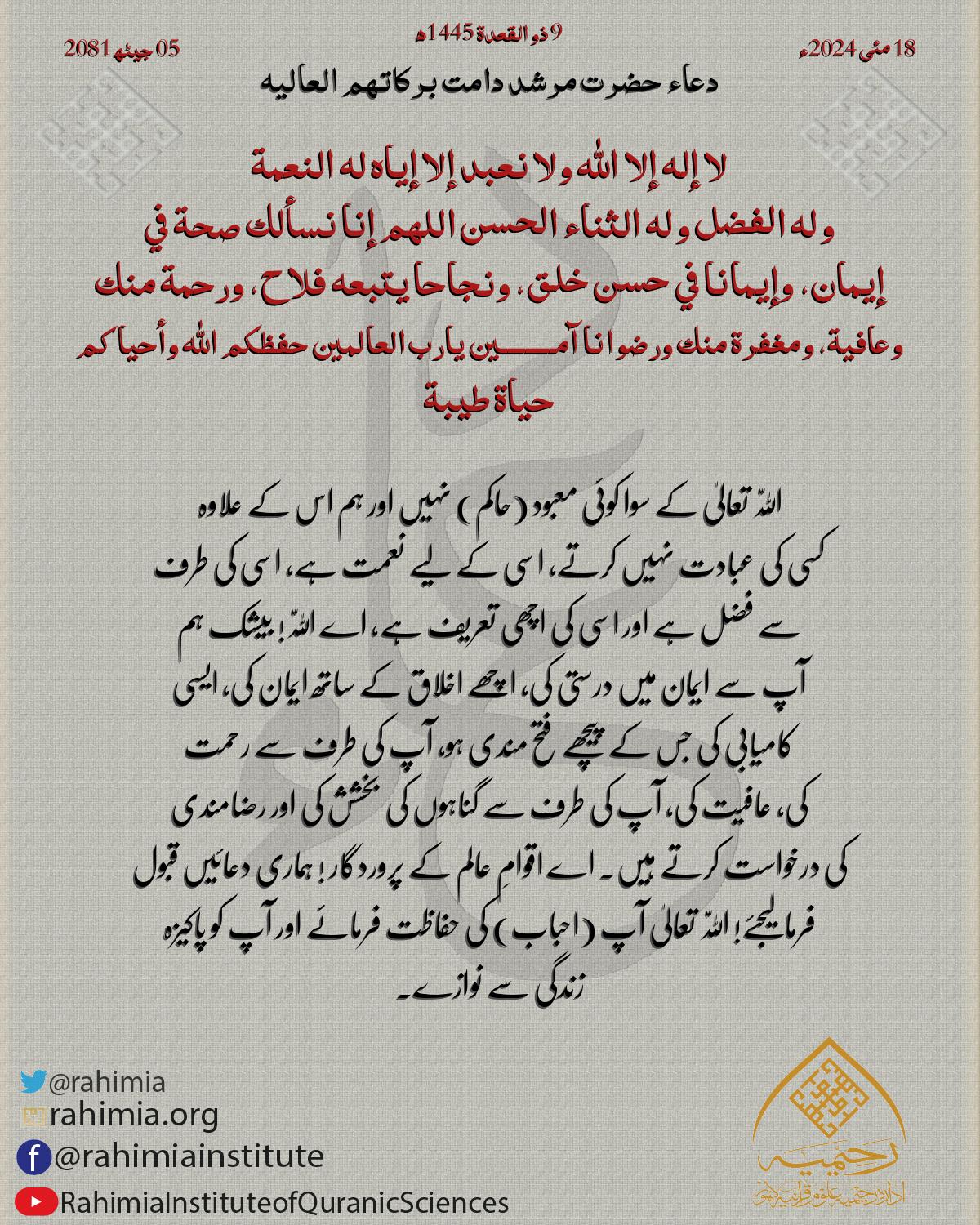 لا إله إلا الله ولا نعبد إلا إياه له النعمة وله الفضل وله الثناء الحسن اللهم إنا نسألك صحة في إيمان، وإيمانا في حسن خلق، و…