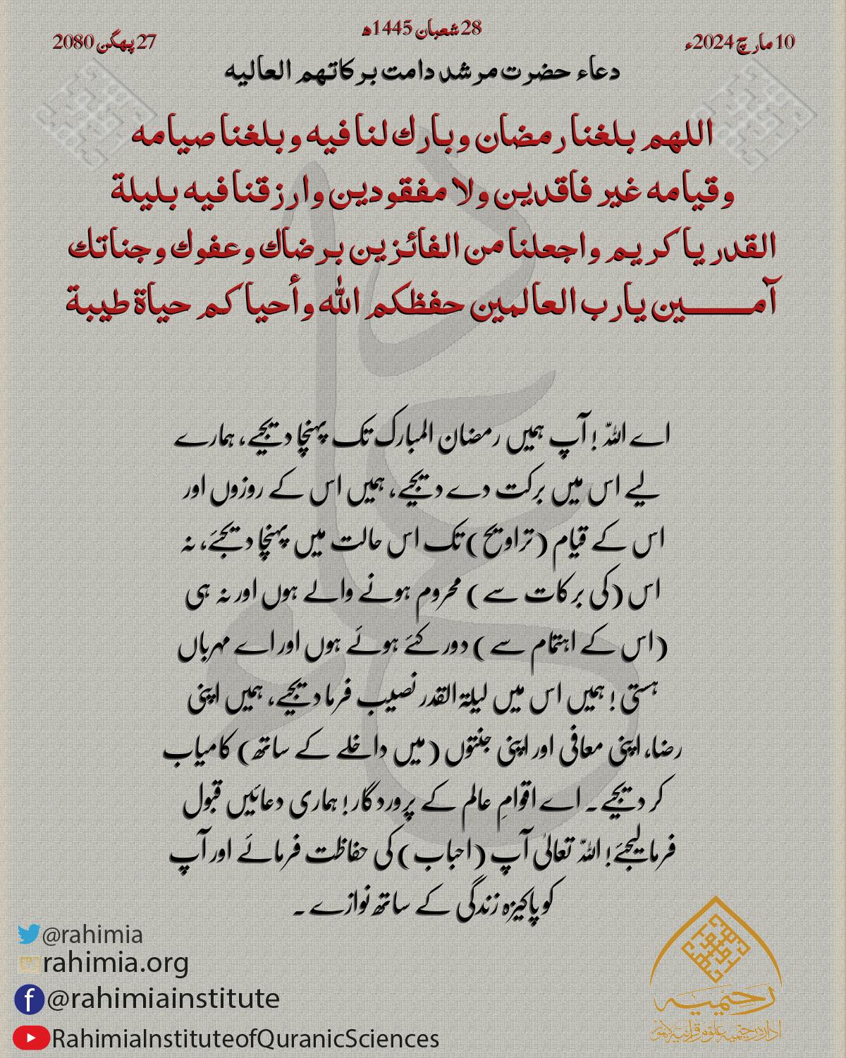 اللهم بلغنا رمضان وبارك لنا فيه وبلغنا صيامه وقيامه غير فاقدين ولا مفقودين وارزقنا فيه بليلة القدر ياكريم واجعلنا من الفا…