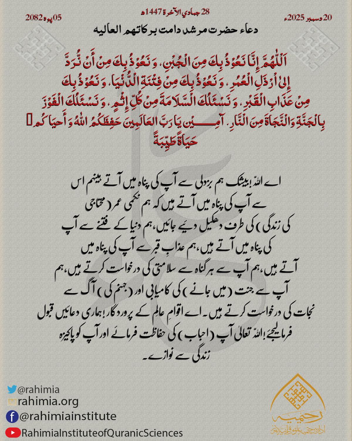 اَلْلّٰهُمَّ إِنَّا نَعُوْذُ بِكَ مِنَ الْجُبْنِ، وَ نَعُوْذُ بِكَ مِنْ أَنْ نُّرَدَّ إِلیٰ اْرْذَلِ الْعُمُرِ، وَ نَعُوْذُ بِكَ مِنْ فِتْنَةِ الْدُّنْیَا، وَ نَعُوْذُ بِكَ مِنْ عَذَابِ الْقَبْرِ، وَ نَسْئَلُكَ …