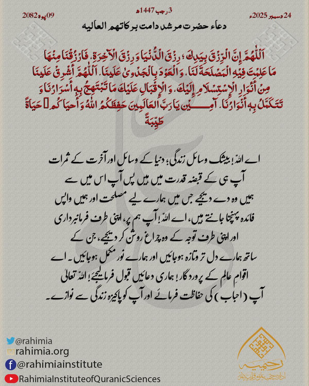 اَلْلّٰهُمَّ إِنَّ الْرِّزْقَ بِیَدِكَ ؛ رِزْقَ الْدُّنْیَا وَ رِزْقَ الْآخِرَةِ، فَارْزُقْنَا مِنْھَا مَا عَلِمْتَ فِیْهِ الْمَصْلَحَةَ لَنَا، وَ الْعَوْدَ بِالْجَدْویٰ عَلَینَا. اَلْلّٰهُمَّ أَشْرِقْ عَلَینَ…