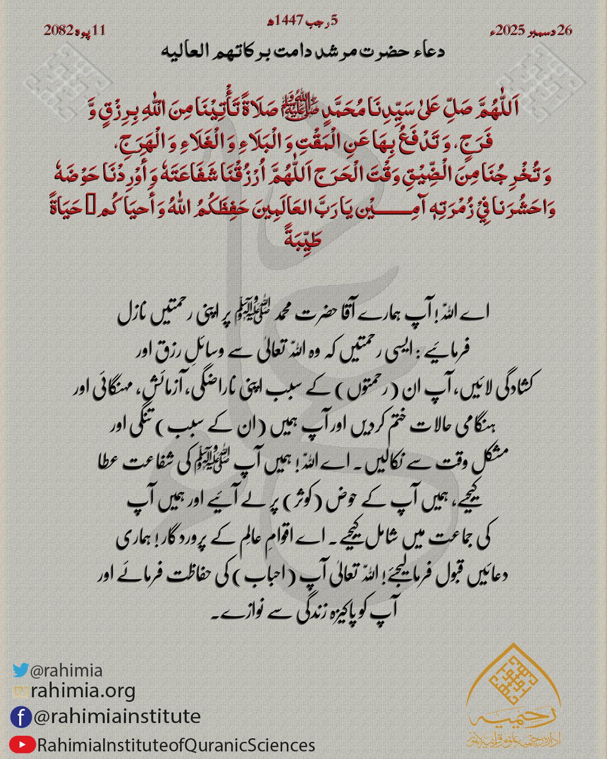 اَللّٰهُمَّ صَلِّ عَلیٰ سَیِّدِنَا مُحَمَّدٍ ﷺ صَلَاةً تَأْتِیْنَا مِنَ الْلّٰهِ بِرِزْقٍ وَّ فَرَجٍ، وَ تَدْفَعُ بِھَا عَنِ الْمَقْتِ وَ الْبَلَاءِ وَ الْغَلَاءِ وَ الْھَرَجِ، وَ تُخْرِجُنَا مِنَ الْضِّیْقِ وَقْتَ ا…