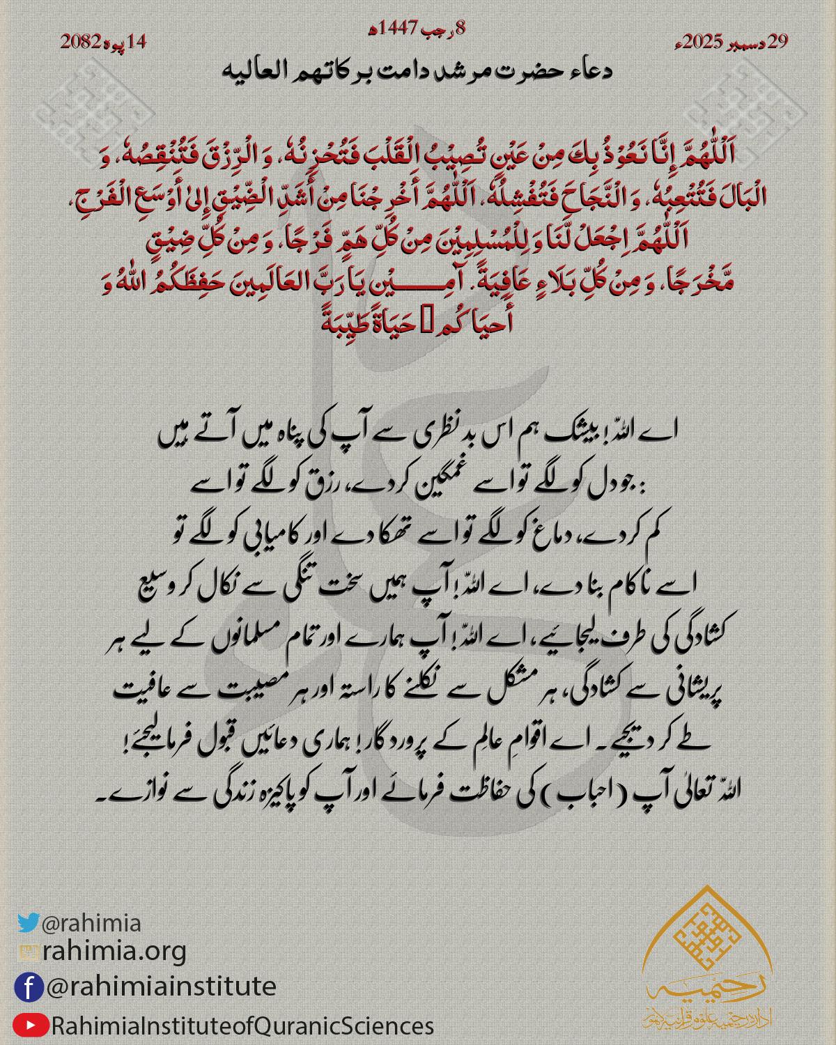 اَلْلّٰهُمَّ إِنَّا نَعُوْذُ بِكَ مِنْ عَیْنٍ تُصِیْبُ الْقَلْبَ فَتُحْزِنُهٗ، وَ الْرِّزْقَ فَتُنْقِصُهٗ، وَ الْبَالَ فَتُتْعِبُهٗ، وَ الْنَّجَاحَ فَتُفْشِلُهٗ، اَلْلّٰهُمَّ أَخْرِجْنَا مِنْ أَشَدِّ الْضِّیْقِ إِلیٰ أَوْ…