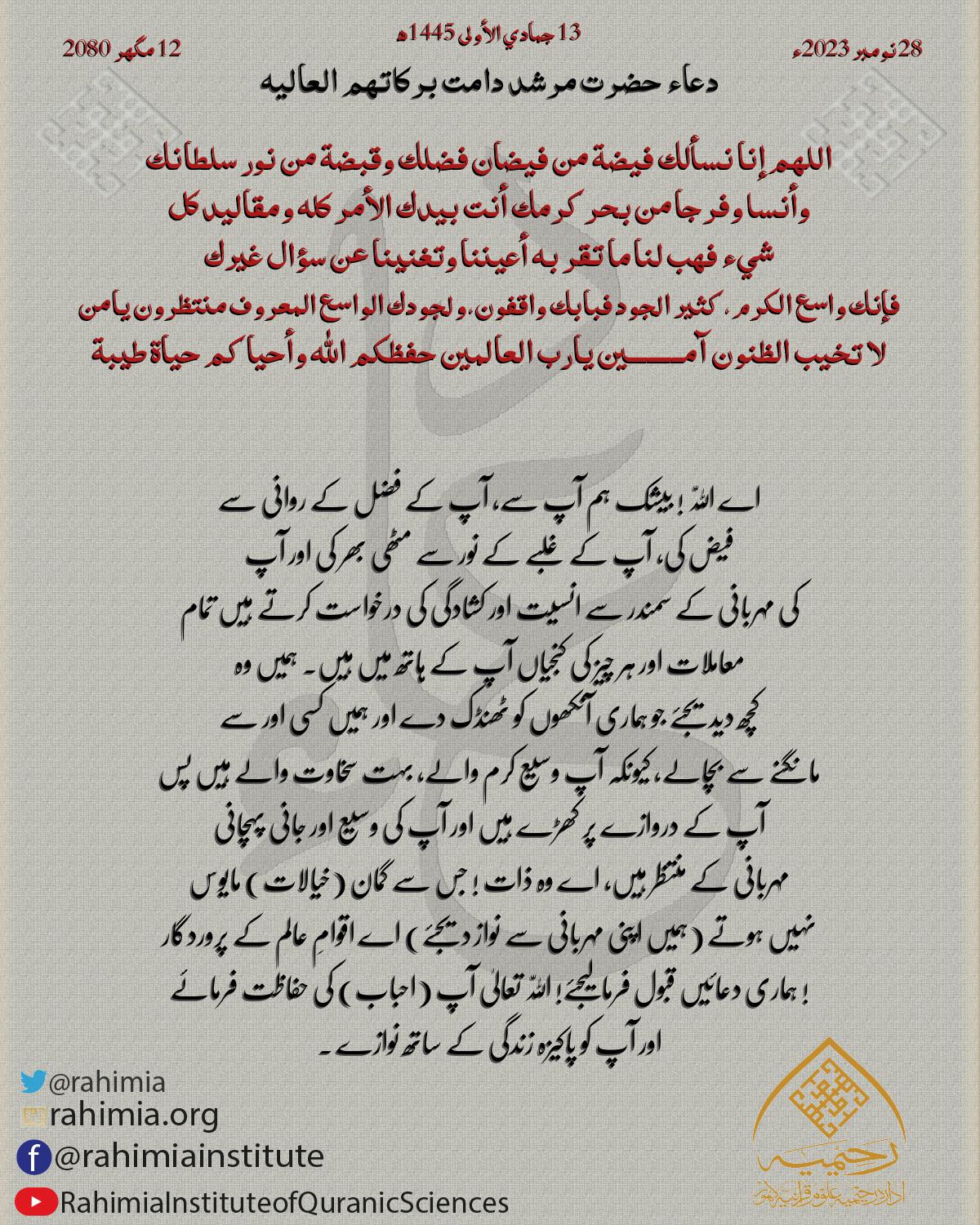 اللهم إنا نسألك فيضة من فيضان فضلك وقبضة من نور سلطانك وأنسا وفرجا من بحر كرمك أنت بيدك الأمر كله ومقاليد كل شيء فهب لن…