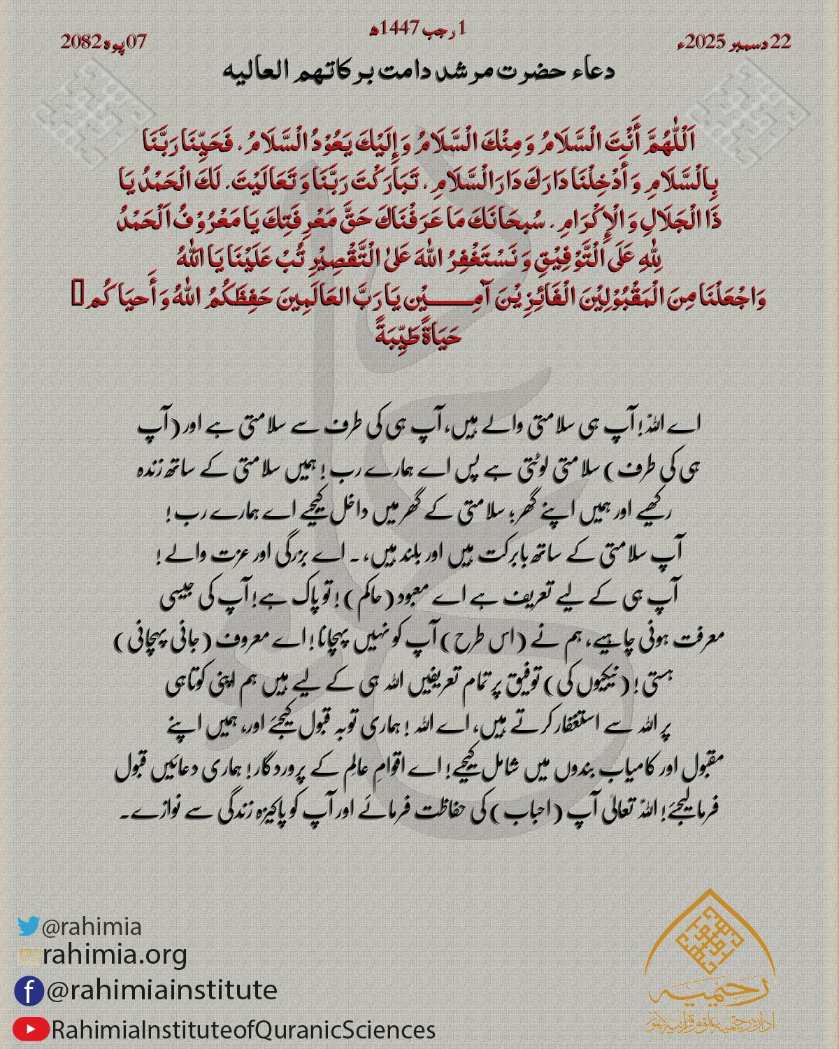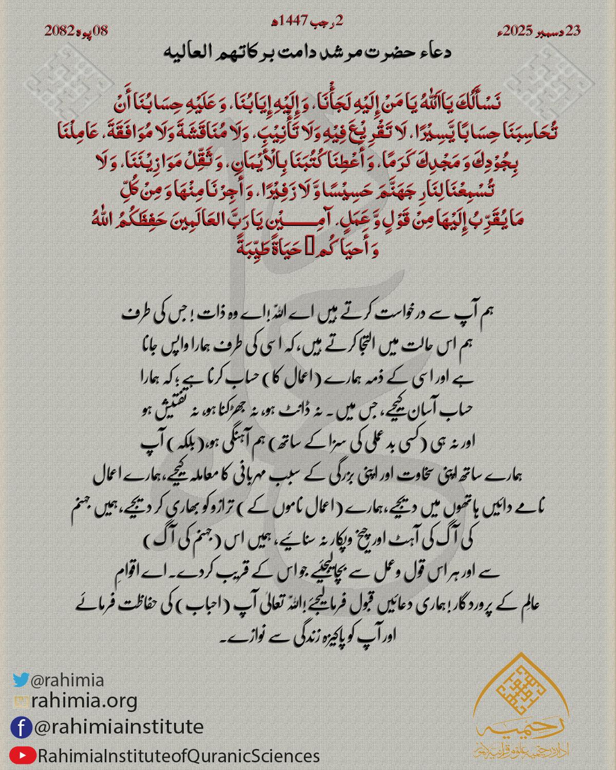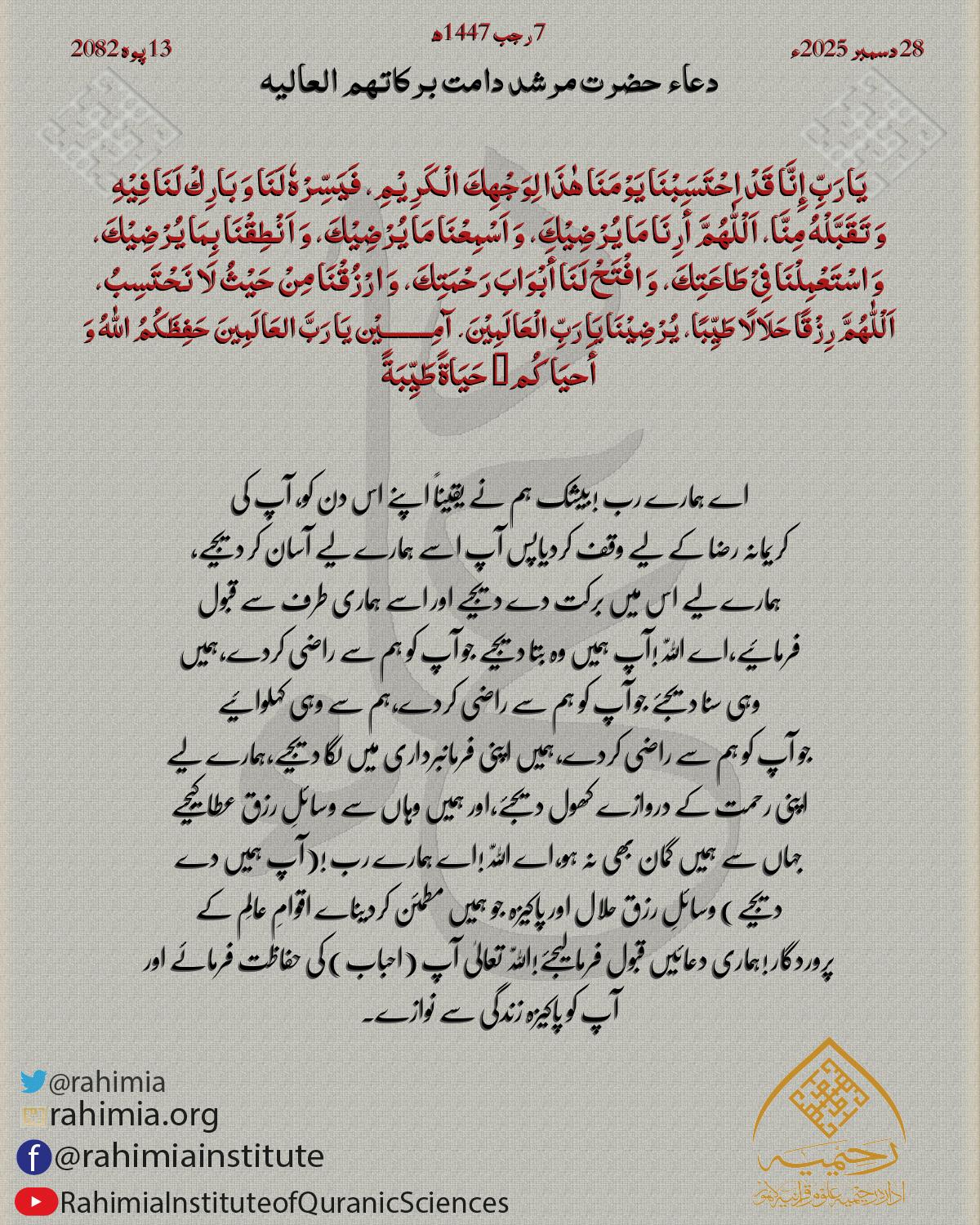 یَا رَبِّ إِنَّا قَدْ اِحْتَسَبْنَا یَوْمَنَا ھٰذَا لِوَجْھِكَ الْکَرِیْمِ، فَیَسِّرْہٗ لَنَا وَ بَارِكْ لَنَا فِیْهِ وَ تَقَبَّلْهُ مِنَّا، اَلْلّٰهُمَّ أَرِنَا مَا یُرْضِیْكَ، وَ اَسْمِعْنَا مَا یُرْضِیْكَ، …