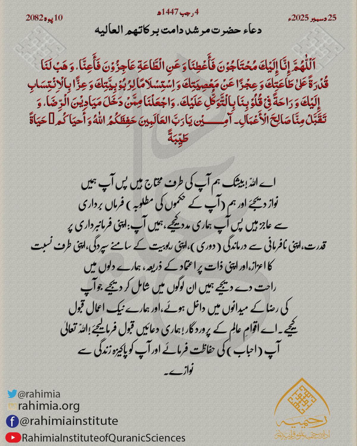 اَلْلّٰهُمَّ إِنَّا إِلَیْكَ مُحْتَاجُوْنَ فَأَعْطِنَا وَ عَنِ الْطَّاعَةِ عَاجِزُوْنَ فَأَعِنَّا، وَ ھَبْ لَنَا قُدْرَةً عَلیٰ طَاعَتِكَ وَ عِجْزًا عَنْ مَعْصِیَتِكَ وَ اِسْتِسْلَامًا لِرُبُوْبِیَّتِكَ وَ عِزًّا بِا…