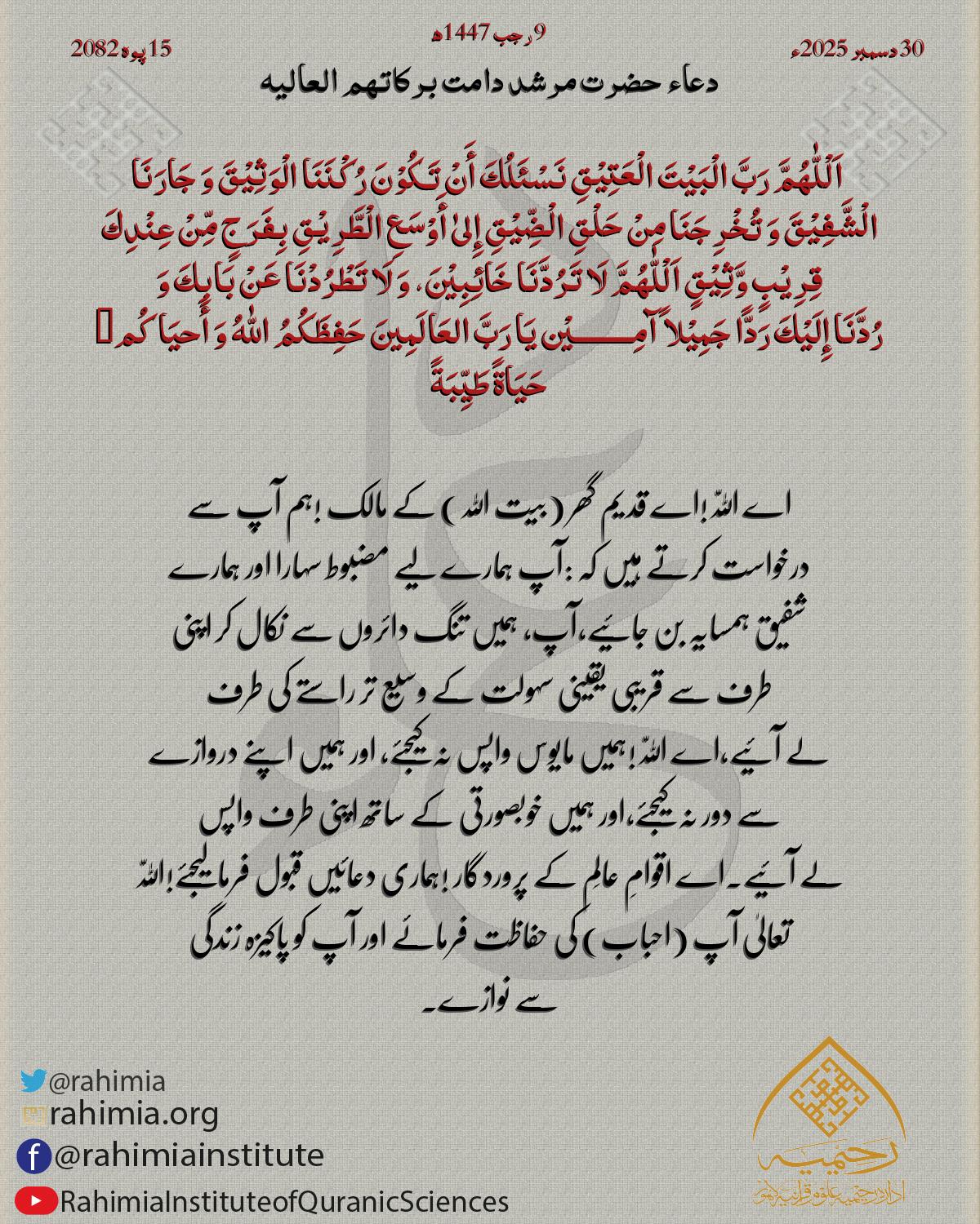 اَلْلّٰهُمَّ رَبَّ الْبَیْتَ الْعَتِیْقِ نَسْئَلُكَ أَنْ تَکُوْنَ رُکْنَنَا الْوَثِیْقَ وَ جَارَنَا الْشَّفِیْقَ وَ تُخْرِجَنَا مِنْ حَلْقِ الْضِّیْقِ إِلیٰ أَوْسَعِ الْطَّرِیْقِ بِفَرَجٍ مِّنْ عِنْدِكَ قِرِیْبٍ وَّثِیْقٍ…