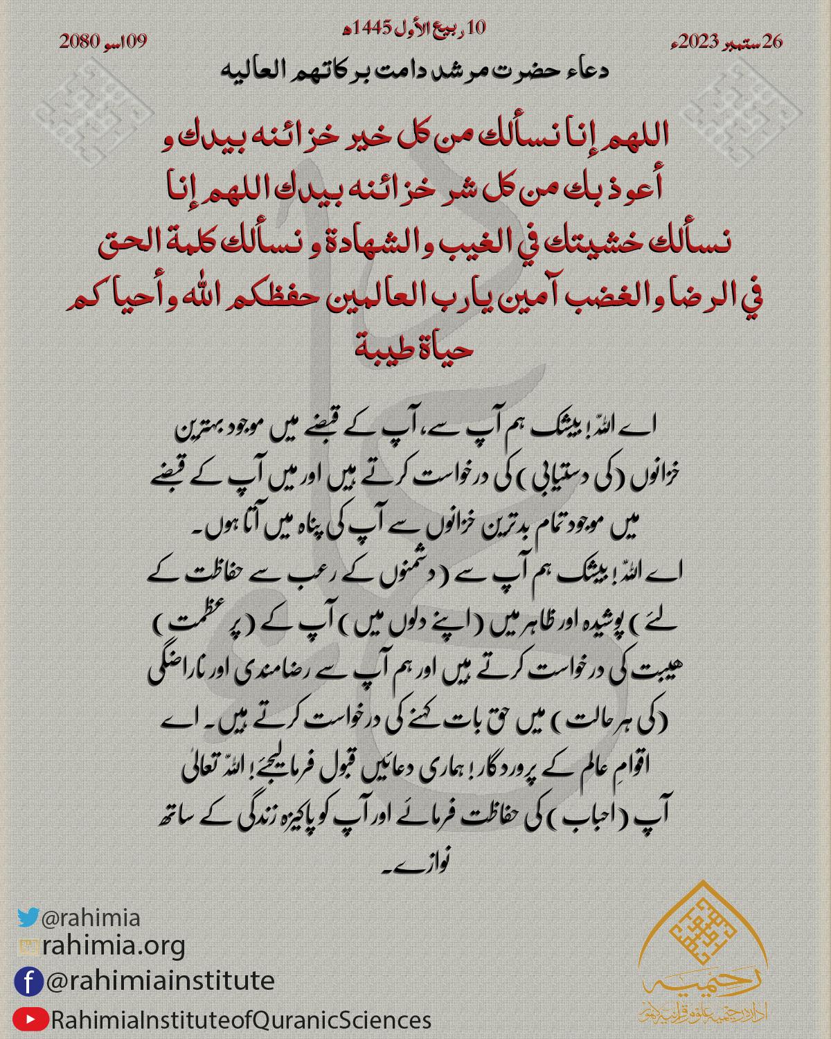 اللهم إنا نسألك من كل خير خزائنه بيدك و أعوذ بك من كل شر خزائنه بيدك اللهم إنا نسألك خشيتك في الغيب والشهادة و نسألك كلمة ا…