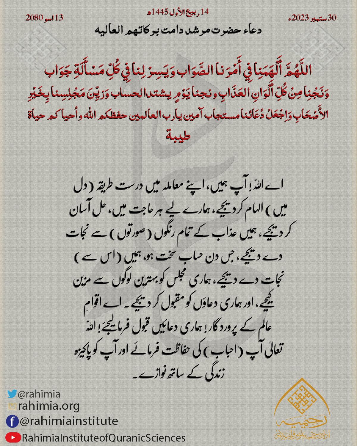 اللَّهُمَّ أَلْهَمَنِا فِي أَمْرَنا الصَّوَاب وَيَسِرْ لِنا فِي كُلِّ مَسْأَلَةِ جَوَاب وَنَجْنِا مِنْ كُلِّ أَلْوَانِ العَذَابِ ونجنا يَوْمٍ يشتدالحساب وَزيِّنَ مَجْلِسِنا بِخَ…