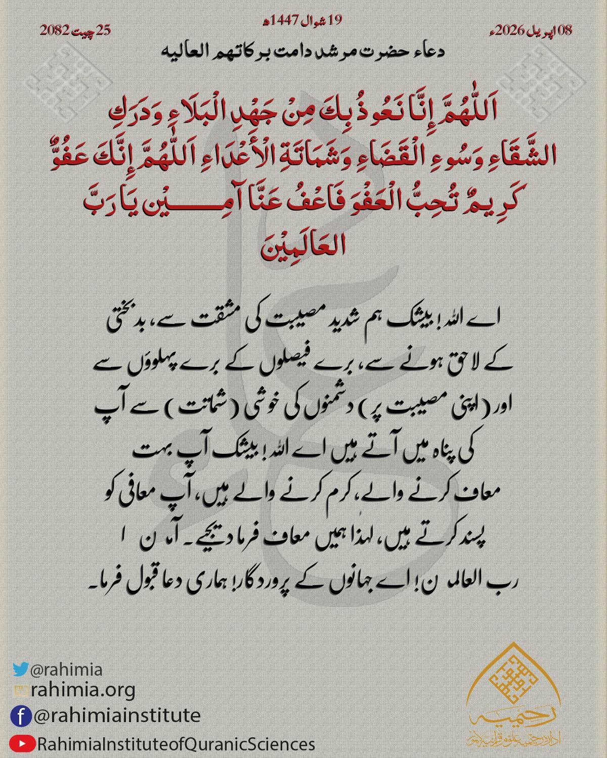 اَللّٰهُمَّ إِنَّا نَعُوذُ بِكَ مِنْ جَهْدِ الْبَلَاءِ وَدَرَكِ الشَّقَاءِ وَسُوءِ الْقَضَاءِ وَشَمَاتَةِ الْأَعْدَاءِ اَللّٰهُمَّ إِنَّكَ عَفُوٌّ كَرِيمٌ تُحِبُّ الْعَفْوَ فَاعْفُ عَنَّا آمِـــــــــيْن …