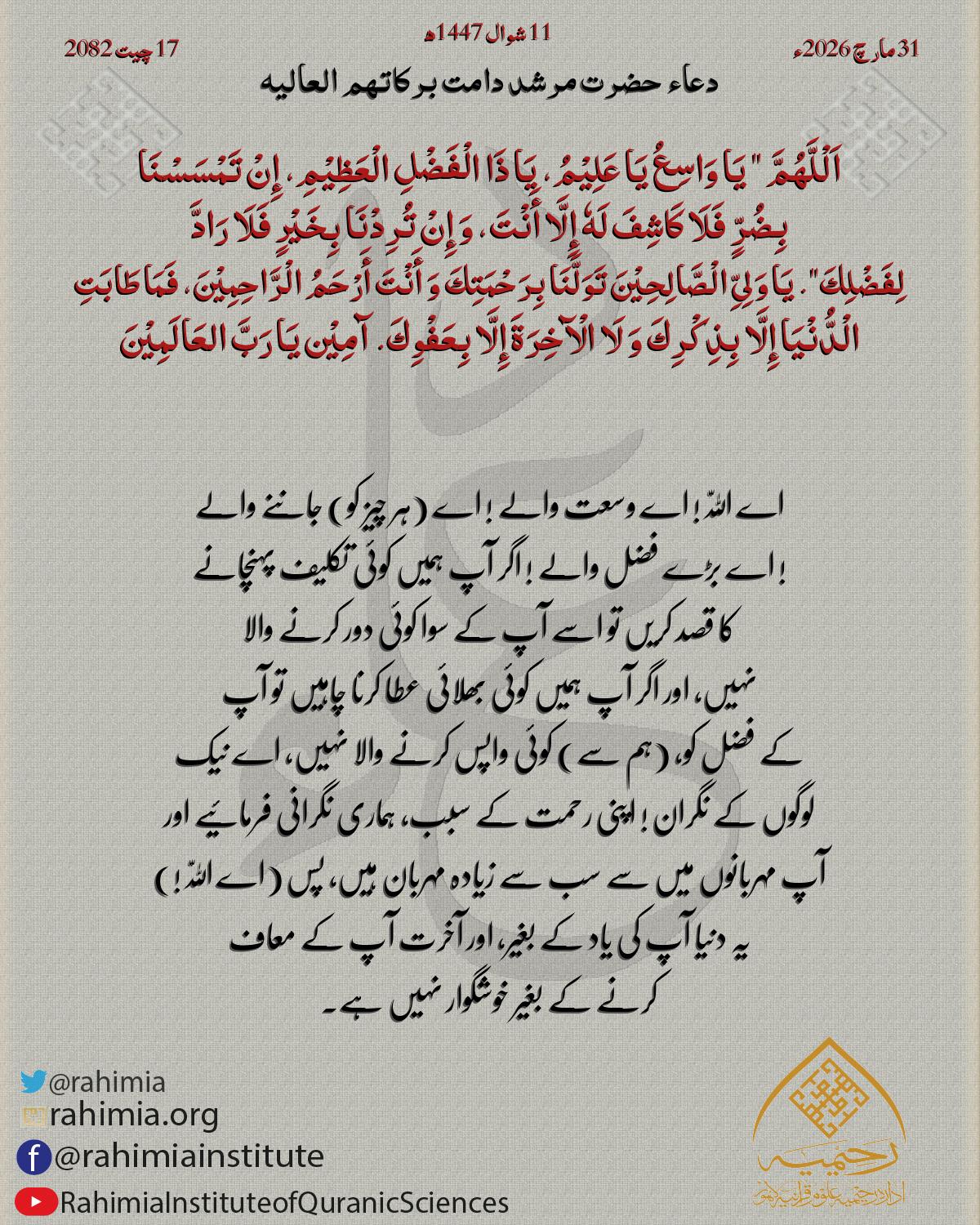 اَلْلَّهُمَّ " یَا وَاسِعُ یَا عَلِیْمُ، یَا ذَا الْفَضْلِ الْعَظِیْمِ، إِنْ تَمْسَسْنَا بِضُرٍّ فَلَا کَاشِفَ لَهٗ إِلَّا أَنْتَ، وَ إِنْ تُرِدْنَا بِخَیْرٍ فَلَا رَادَّ لِفَضْلِكَ". یَا وَلِیِّ الْصَّا…