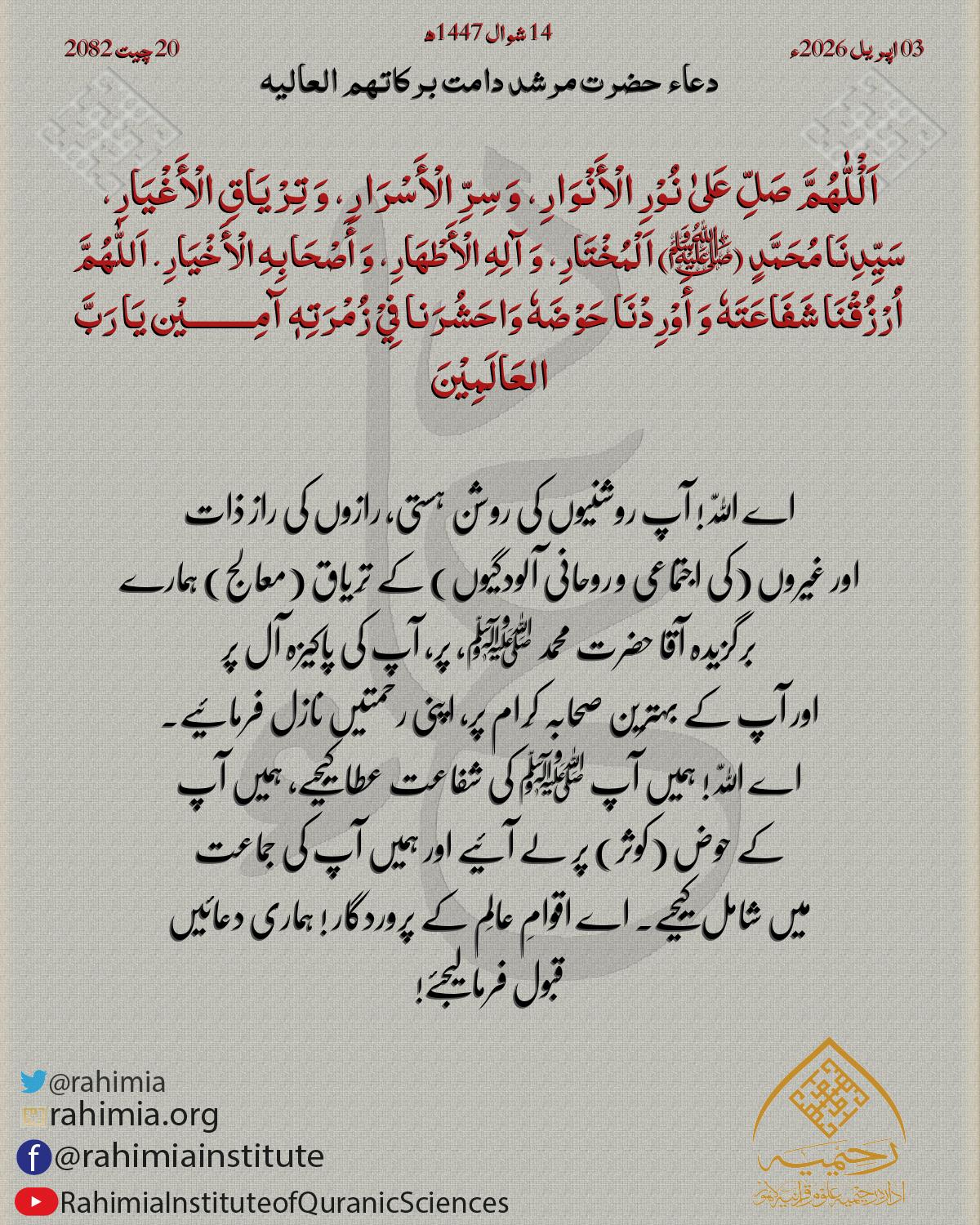 اَلْْلّٰهُمَّ صَلِّ عَلیٰ نُوْرِ الْأَنْوَارِ، وَ سِرِّ الْأَسْرَارِ، وَ تِرْیَاقِ الْأَغْیَارِ، سَیِّدِنَا مُحَمَّدٍ (ﷺ) اَلْمُخْتَارِ، وَ آلِهِ الْأَطْھَارِ، وَ أَصْحَابِهِ الْأَخْیَارِ. اَللّٰهُمَّ اُرْزُقْنَ…