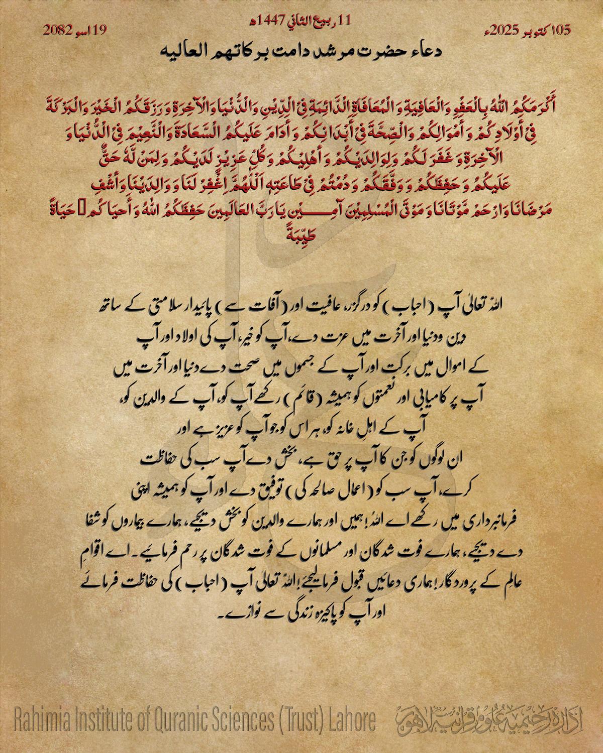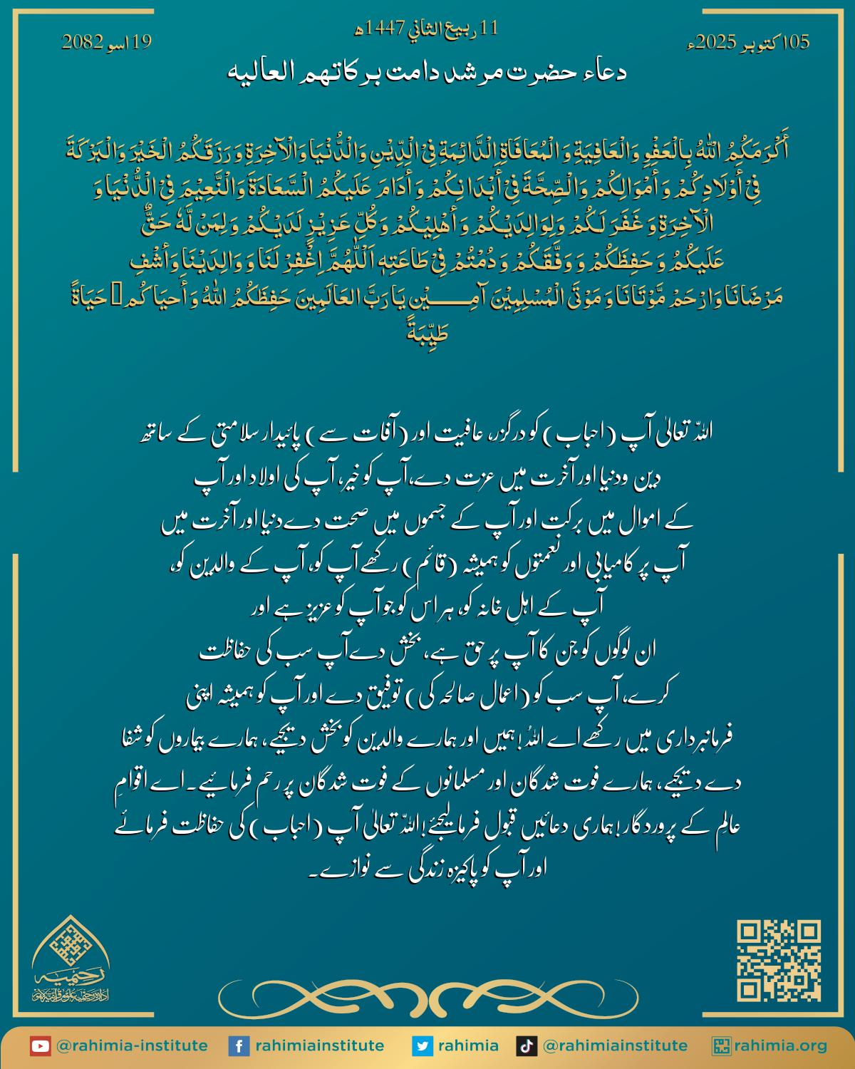 آپ سب کی حفاظت کرے، آپ سب کو (اعمال صالحہ کی) توفیق دے اور آپ کو ہمیشہ اپنی فرمانبرداری میں رکھے