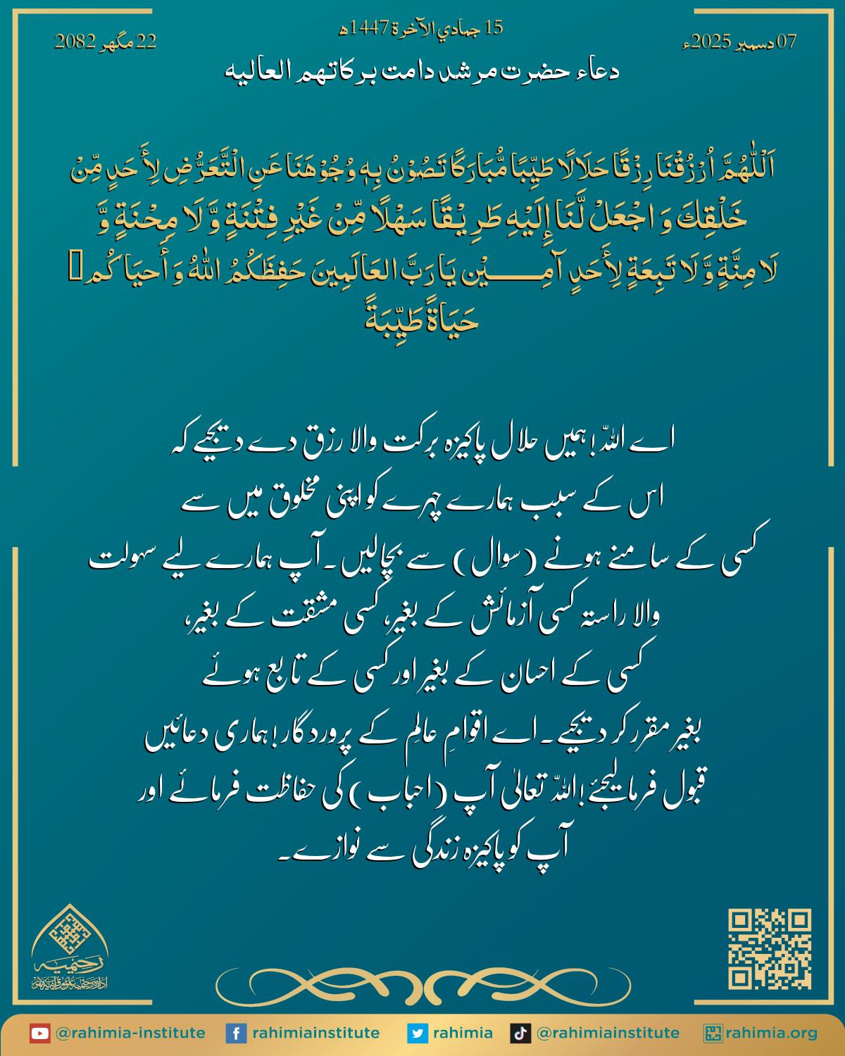 ہمیں حلال پاکیزہ برکت والا رزق دے دیجیے کہ اس کے سبب ہمارے چہرے کو اپنی مخلوق میں سے کسی کے سامنے ہونے (سوال) سے بچالیں۔
