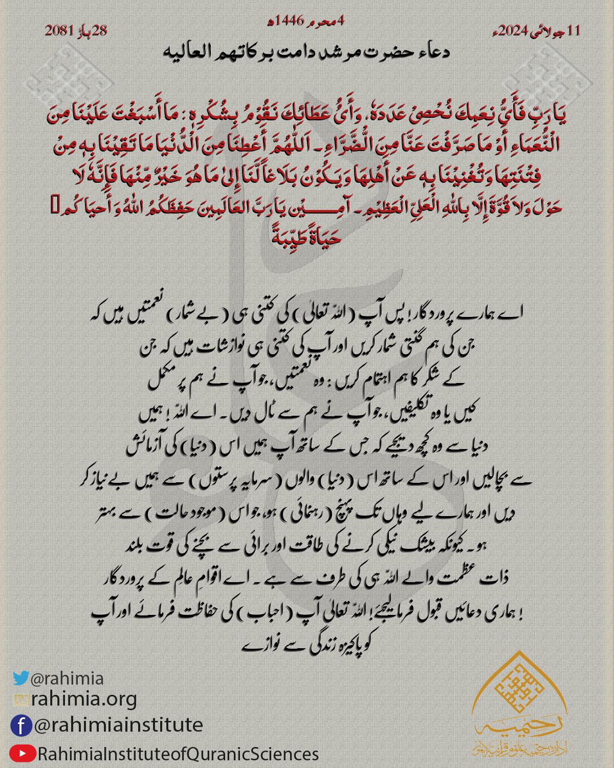 یَا رَبِّ فَأَیُّ نِعَمِكَ نُحْصِیْ عَدَدَهٗ، وَأَیُُ عَطَائِكَ نَقُوْمُ بِشُکْرِهٖ : مَا أَسْبَغْتَ عَلَیْنَا مِنَ الْنُّعَمَاءِ أَوْ مَا صَرَّفْتَ عَنَّا مِنَ الّْضَّرَّاءِ۔ اَللّٰھُمَّ أَعْطِنَا مِنَ الْدُّنْیَ…