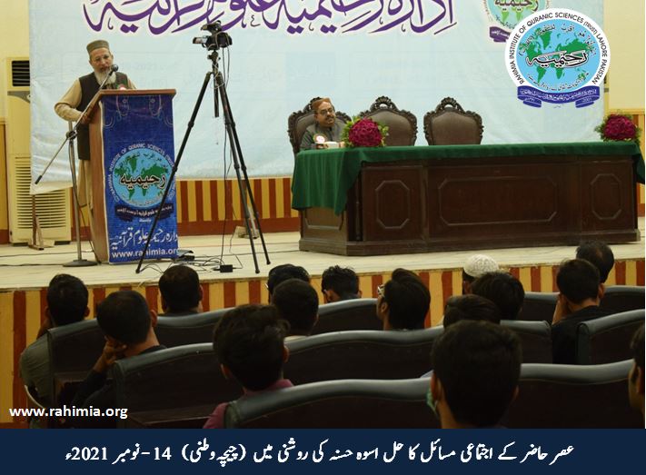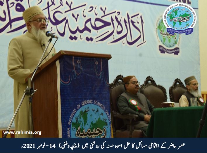 حضرت اقدس نے فرمایا کہ کسی بھی اجتماع کو پرکھنے کے چار اصول (قومی آزادی، اجتماعی عدل، معاشی خوشحالی، سیاسی امن) ہیں۔ ان اصول پر 74سالوں کا جائزہ لیجیے کہ پاکستان اسلام کے نام پر حاصل کیاگیا۔ کیا97%مسلم آبادی میں ان اصول پر عملی نظام موجود ہے؟ آج ہم نے اگر اپنی قومی ریاست بچانی ہے تومذکورہ بالا چاروں اصولوں کو آپ ﷺ کی سیرت سے سمجھ کر سوسائٹی کی تشکیل کرنا ہوگی۔"