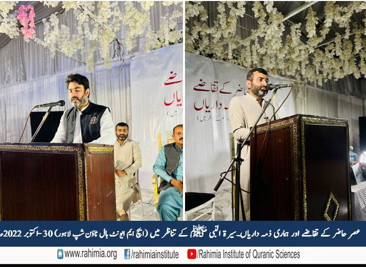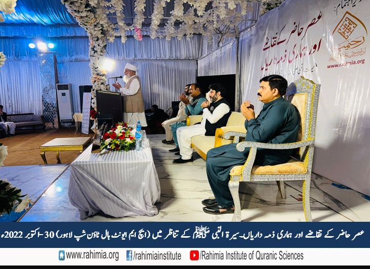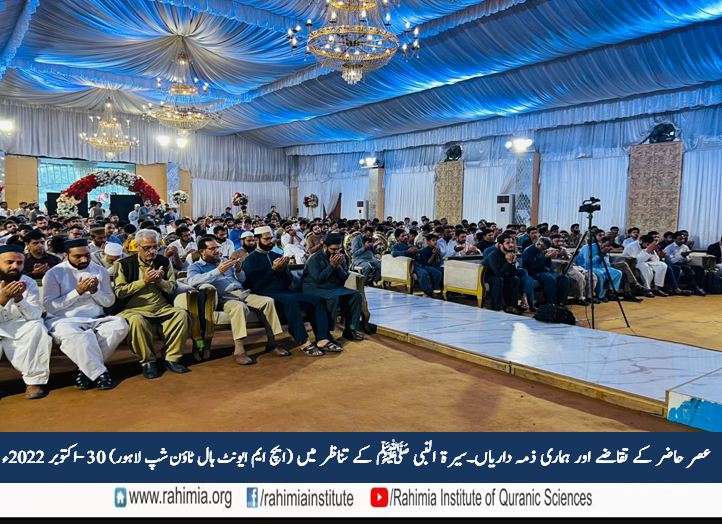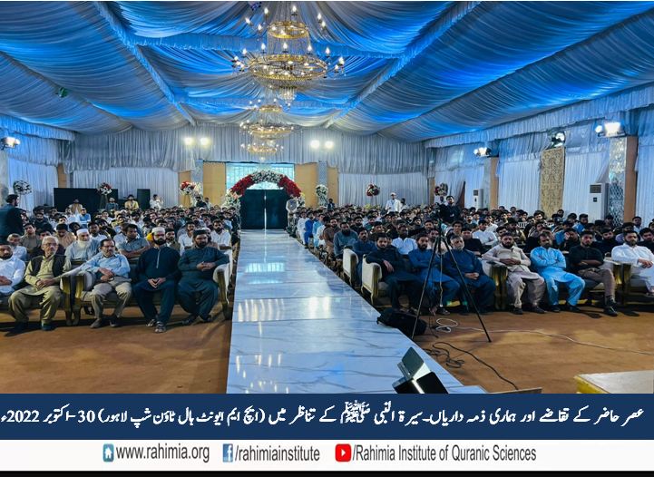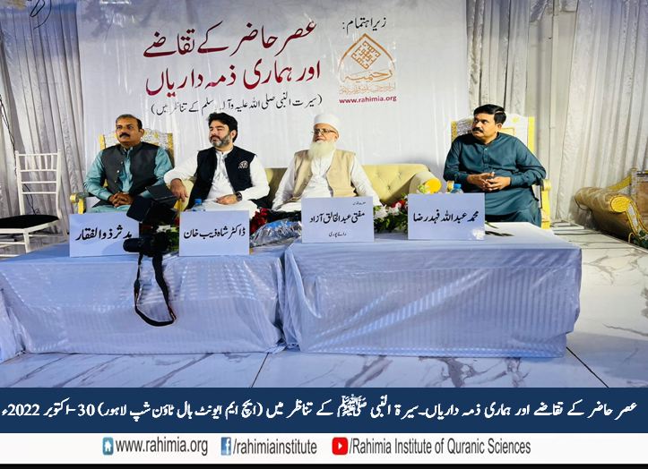 مورخہ 30 اکتوبر 2022 ء بروز اتوار ایچ ایم ایونٹ ہال لاہور میں ادارہ رحیمیہ علومِ قرآنیہ (ٹرسٹ) لاہور کے زیر اہتمام "عصر حاضر کے تقاضے اور ہماری ذمہ داریاں ۔ سیرت النبی ﷺ کے تناظر میں" کے موضوع پر ایک پر وقار سیمینار منعقد ہوا۔ سیمینار کے مہمانِ خصوصی ڈائریکٹر جنرل ادارہ رحیمیہ علوم قرآنیہ (ٹرسٹ) لاہور اور مسند نشین خانقاہ عالیہ رحیمیہ رائے پور مولانا مفتی عبدالخالق آزاد رائے پوری تھے۔ سیمینار کی نظامت ڈاکٹر آصف نوید نے کی۔ جناب مدثر ذوالفقارکی صدارت میں ہونے والے اس سیمینار میں تلاوت کلام پاک کا شرف حافظ بلال احمد نے حاصل کیا جب کہ آنحضرت ﷺ کے حضور ہدیہ عقیدت جناب انعام اللہ نے پیش کئے۔