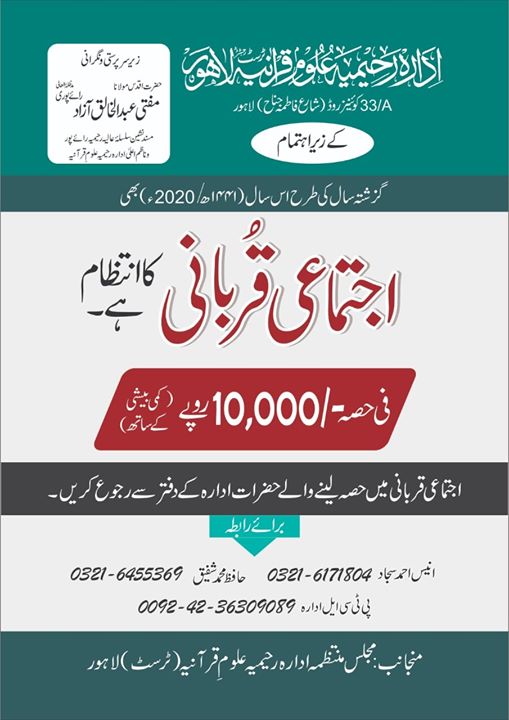 گزشتہ سالوں کی طرح اس سال بھی اجتماعی قربانی کا انتظام کیا گیا ہے۔ اجتماعی قربانی میں حصہ لینے والے حضرات ادارہ کے دفتر سے رجوع کریں۔