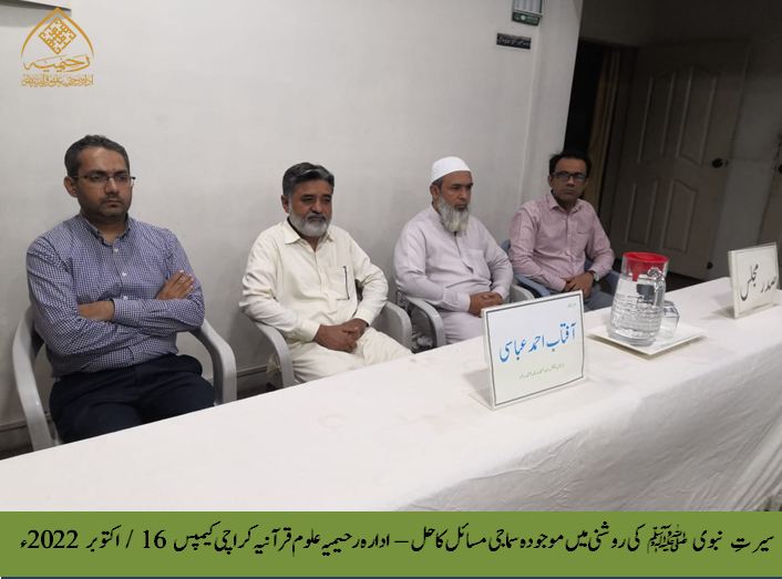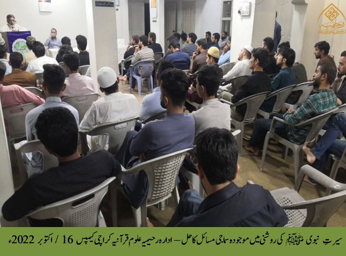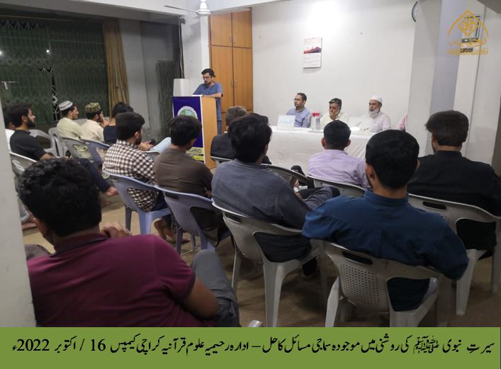 ادارہ رحیمیہ علومِ قرآنیہ ٹرسٹ کراچی کیمپس کے زیر انتظام مورخہ 16 اکتوبر 2022ء بروز اتوار بعداز نماز مغرب 07:15 ادارہ رحیمیہ کے سیمینار ہال میں بالخصوص یونیورسٹیز اور کالجز کے طلباء کے لیے دعوتی سیمینار بعنوان "سیرتِ نبوی ﷺ کی روشنی میں موجودہ سماجی مسائل کا حل" کا انعقاد کیا گیا۔ جس کی صدارت ڈاکٹر عبدالحمید جاکھیرانی نے کی۔ جب کہ نظامت کے فرائض ڈاکٹر ملک عابد علی نے ادا کئے۔