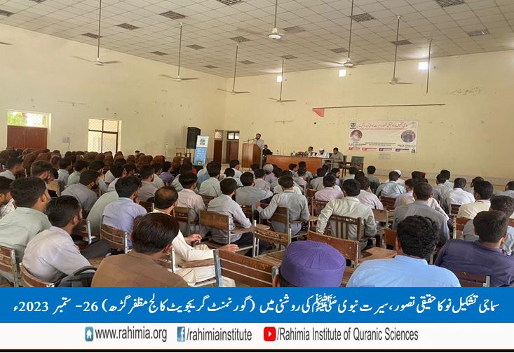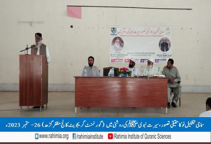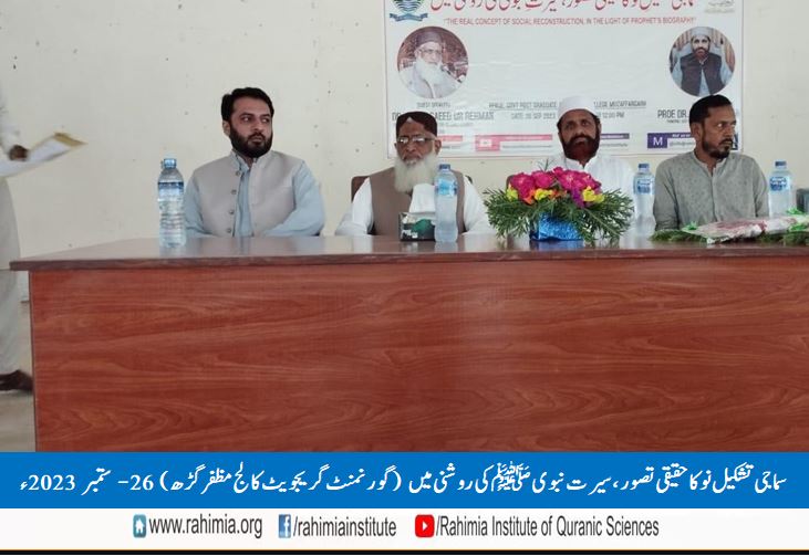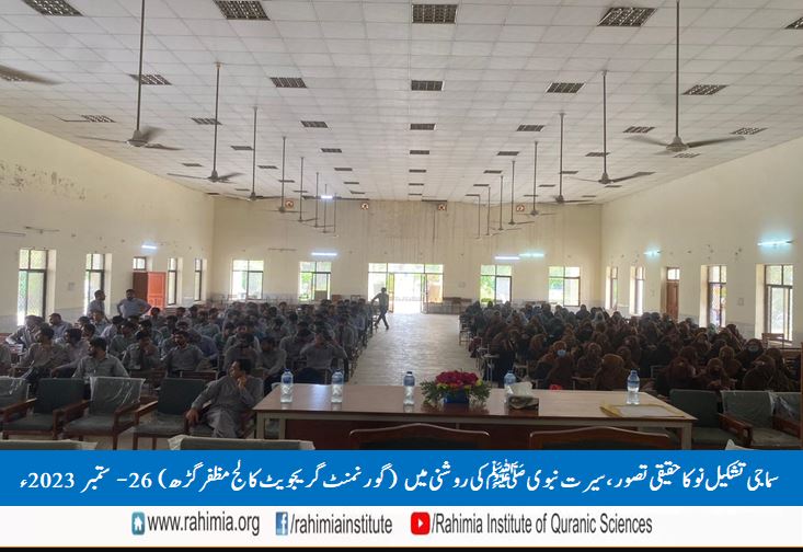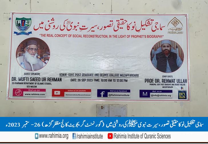 26ستمبر 2023ء بروز منگل کو ادارہ رحیمیہ علوم قرآنیہ (ٹرسٹ )لاہور کیمپس مظفرگڑھ کے زیراہتمام گورنمنٹ گریجویٹ کالج مظفرگڑھ کی انتظامیہ کے تعاون سے کالج کے ملٹی پرپز ہال میں "سماجی تشکیل نو کا حقیقی تصور، سیرت نبویﷺ کی روشنی میں" کے عنوان سے ایک سیمینار منعقد ہوا۔ سیمینار کے مہمانِ خصوصی سرپرست ادارہ رحیمیہ علوم قرآنیہ (ٹرسٹ )لاہور ڈاکٹرمفتی سعید الرحمٰن تھے۔ ڈاکٹر عامر فرقان (ریجنل کوآرڈینیٹر ادارہ رحیمیہ ملتان کیمپس) نے بطور مہمان اعزاری شرکت کی۔