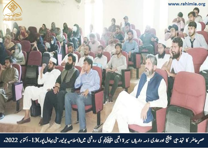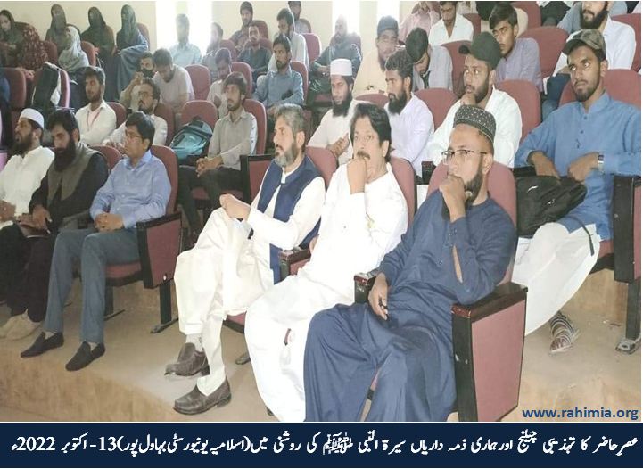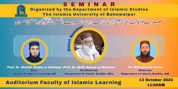 مورخہ 13 اکتوبر 2022ء بروز جمعرات فیکلٹی آف اسلامک لرننگ، اسلامیہ یونیورسٹی بہاول پور میں "عصرِ حاضر کا تہذیبی چیلنج اور ہماری ذمہ داریاں سیرت النبی ﷺ کی روشنی میں" کے موضوع پر ایک پُر وقار سیمینار کا انعقاد کیا گیا۔