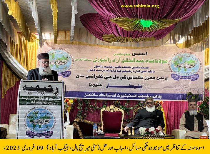 حضرت اقدس کے سیرتِ مبارکہ کے عملی پہلوؤں کو اجاگر کرنے کے بعد مزید فرمایا کہ،"اداراہ رحیمیہ علوم قرآنیہ پورے ملک کے نوجوانوں میں سیرتِ مبارکہ ﷺ کا یہی شعور اجاگر کر رہا ہے۔ ان میں نظام کے بنیادی اداروں کو سمجھ کر ان کو چلانے کی صلاحیت پیدا کررہا ہے"۔