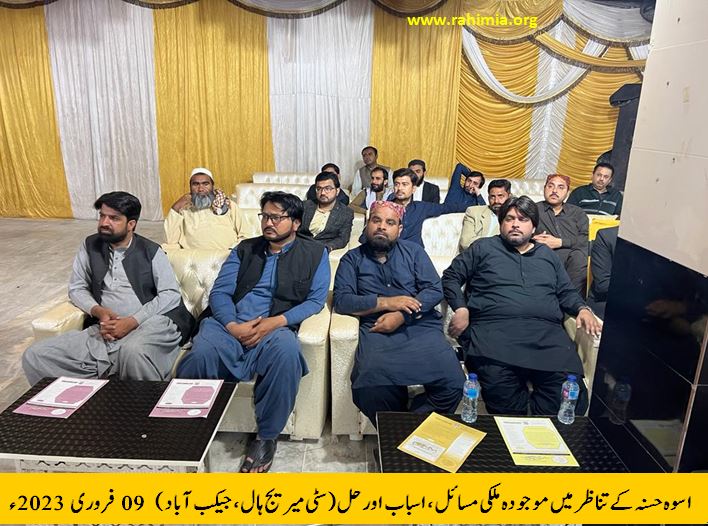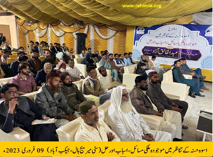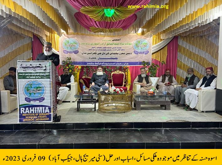 سیمینار کا آغاز حسب دستور تلاوت قرآن پاک سے ہوا جس کی سعادت مولانا عبدااللہ سیال نے حاصل کی۔ نظامت کے فرائض قربان علی پھنور نے سرانجام دئے۔ عبدااللہ گھنیو کی صدارت میں ہونے والے اس سیمینار میں ادارہ رحیمیہ علومِ قرآنیہ کا تعارف مولانا مفتی عبدالمتین نعمانی صاحب نے پیش کیا۔ سیمینار کے مہمانِ خصوصی حضرت اقدس مفتی عبدالخالق آزاد رائے پوری نے "اسوہ حسنہ ﷺ کے تناظر میں موجودہ ملکی مسائل، اسباب اور حل" کے موضوع پر خطاب کرتے ہوئے فرمایا،" آج کے دور کی یہ اہم ترین ضرورت ہے کہ ہمیں اس بات کا ادراک ہو کہ ہم بحیثیتِ قوم کن مسائل سے دوچار ہیں؟ سیاسی، معاشی اور معاشرتی انحطاط کے ساتھ ساتھ آج ہم نظریاتی بحران کا بھی شکار ہیں۔ ان مسائل سے نکلنے کی لئے نوجوانوں کو کوئی راہ سجھائی نہیں دیتی۔ جبکہ نبی آخرالزماں ﷺ کی سیرت کو اختیار کرکے ہم ان مسائل سے نکل سکتے ہیں۔"