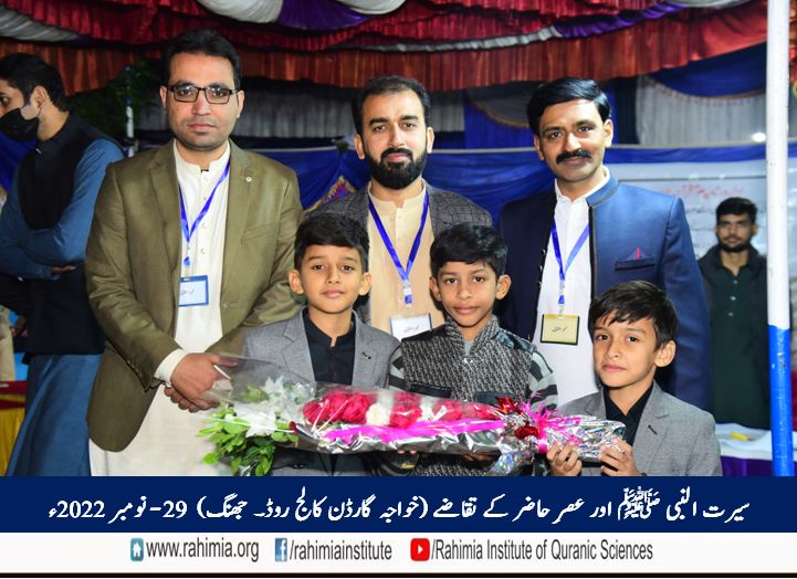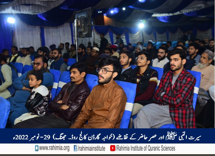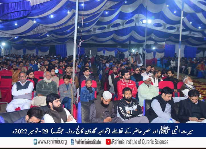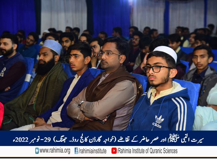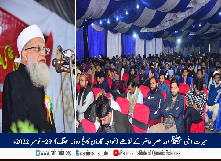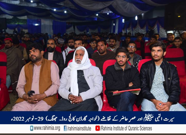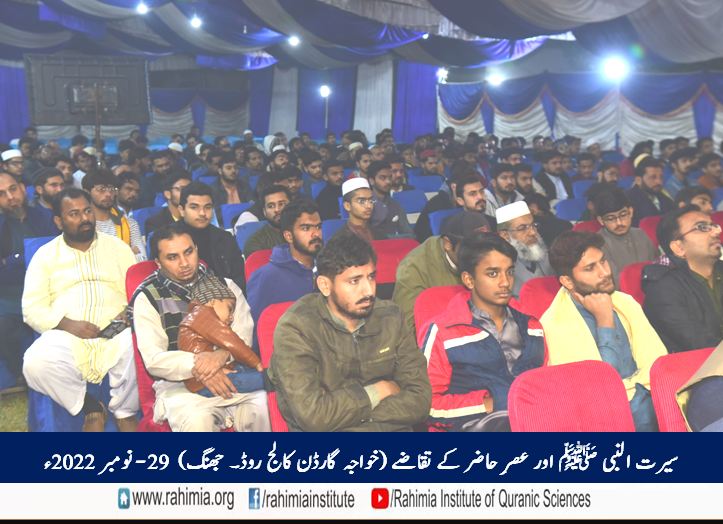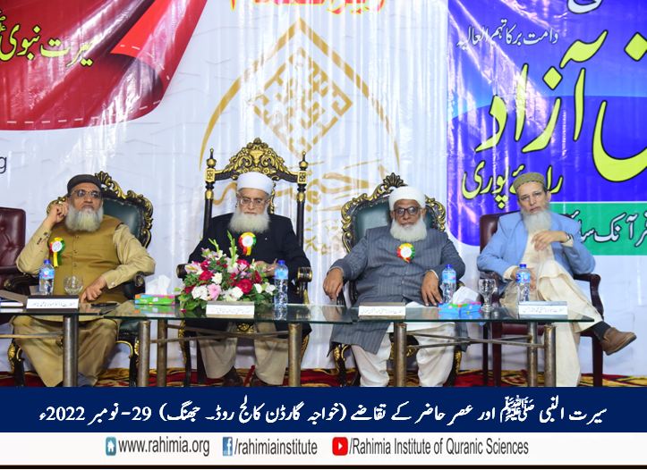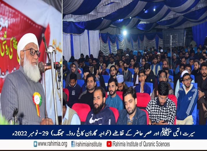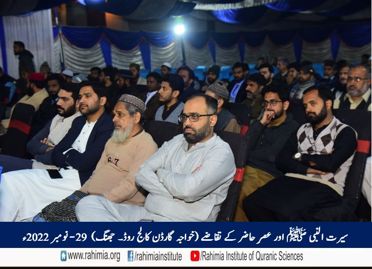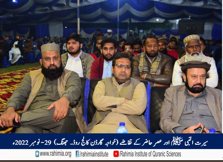 مورخہ 29 نومبر 2022ء بروز منگل, خواجہ گارڈن کالج روڈ جھنگ صدر میں ادارہ رحیمیہ علومِ قرآنیہ (ٹرسٹ) لاہور کے زیرِ اہتمام ”سیرت النبی ﷺ اور عصرِ حاضر کے تقاضے (قومی حالات اور سماجی زوال کے تناظر میں)“ کے موضوع پر ایک شعوری مکالمے کا انعقاد کیا گیا۔ اِس نشست کے مہمانِ خصوصی خانقاہ عالیہ رحیمیہ رائے پور کے مسند نشین اور ناطمِ اعلیٰ ادارہ رحیمیہ علوم قرآنیہ حضرت مفتی عبدالخالق آزاد رائے پوری دامت برکاتہم العالیہ تھے ۔ سیمینار کی صدارت ڈاکٹر محمد ناصر نے کی۔ ناظمِ اجلاس کی ذمہ داری پروفیسر حافظ محمد عثمان نےادا کی۔ تلاوتِ قرآن حکیم کی سعادت پروفیسر اظہار الحق کے حصے میں آئی ، جب کہ نعت رسول مقبول صلی اللہ علیہ وسلم پیش کرنے کا شرف نعمان یوسف کو حاصل ہوا۔