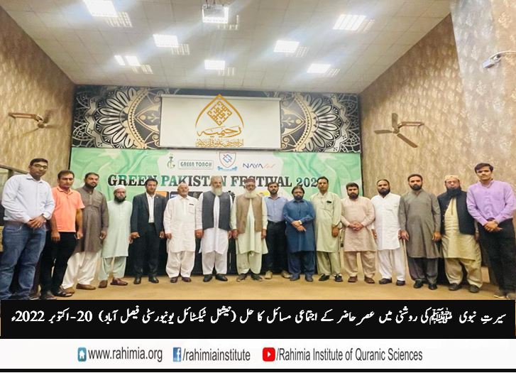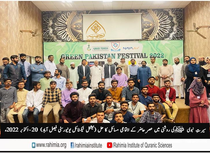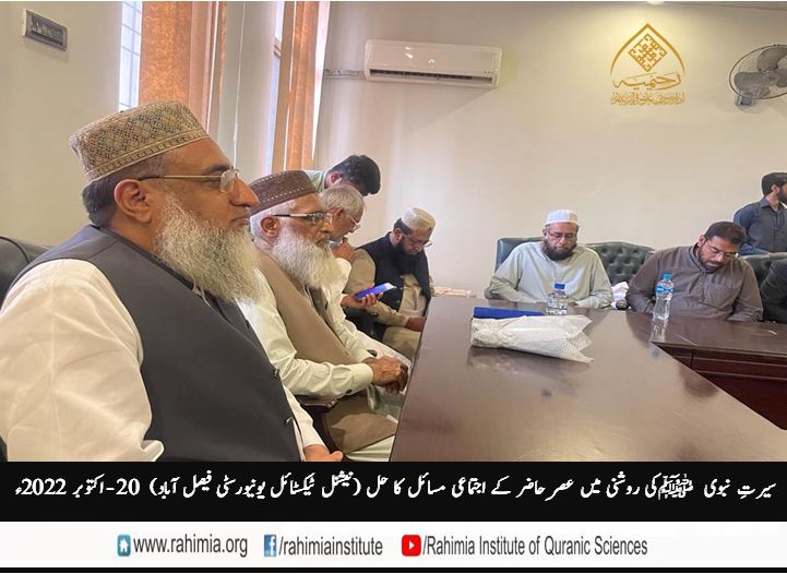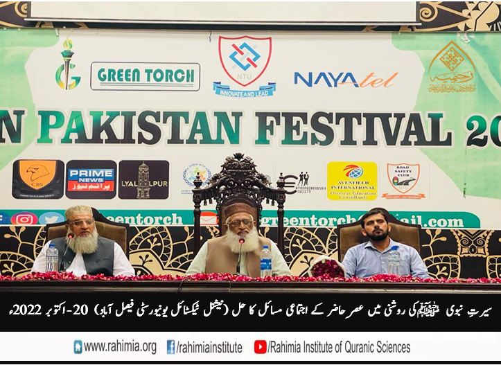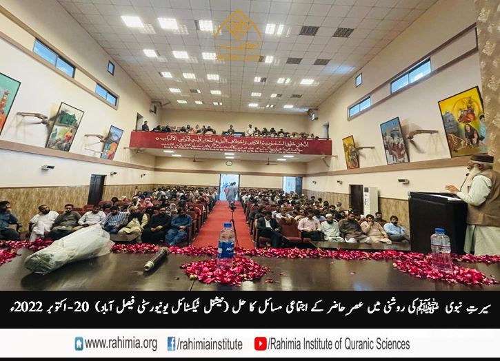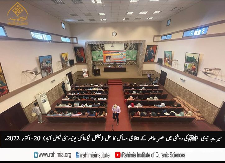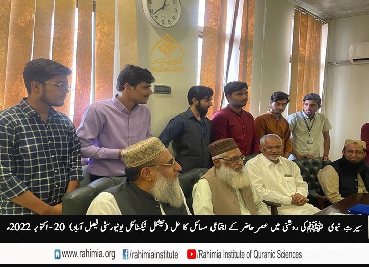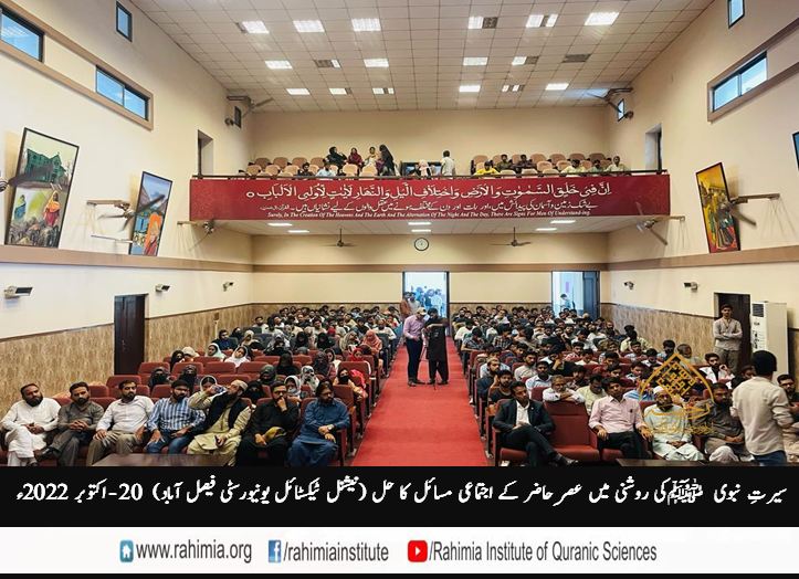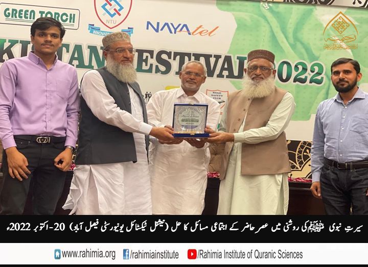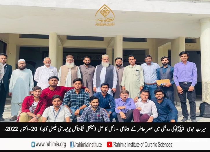 مورخہ 20 اکتوبر 2022ء بروز جمعرات نیشنل ٹیکسٹائل یونیورسٹی فیصل آباد میں قرآن سوسائٹی کے زیرِ اہتمام یونیورسٹی کے مرکزی آڈیٹوریم میں ربیع الاوّل کی مناسبت سے ایک سیمینار کا انعقاد کیا گیا جس کا موضوع ”سیرتِ نبوی ﷺکی روشنی میں عصر ِحاضر کے اجتماعی مسائل کاحل“ تھا۔ سیمینار کے مہمانِ خصوصی ادارہ رحیمیہ علوم قرآنیہ لاہور کے سرپرستِ اعلی ٰ، پروفیسر ڈاکٹر مفتی سعید الرحمان تھے۔ سیمینار میں پروفیسر ڈاکٹر محمد ناصر عبدالعزیز، پروفیسر ڈاکٹر سعید اختر،مولانا محمد علی گنگوہی،جناب عامر شہزاد،جناب صبغت اللہ،شیخ عمر فاروق اور دیگر احباب نے خصوصی طور پر شرکت کی۔ قبل ازیں یونیورسٹی پہنچنے پر اپنے دفتر میں پروفیسر ڈاکٹر یاسر نواب ڈین فیکلٹی آف انجینئرنگ اینڈ ٹیکنالوجی اور دیگر اساتذہ نے مہمان مقرر کا استقبال کیا اور سیمینار کے لیے وقت دینے پر شکریہ ادا کیا ۔