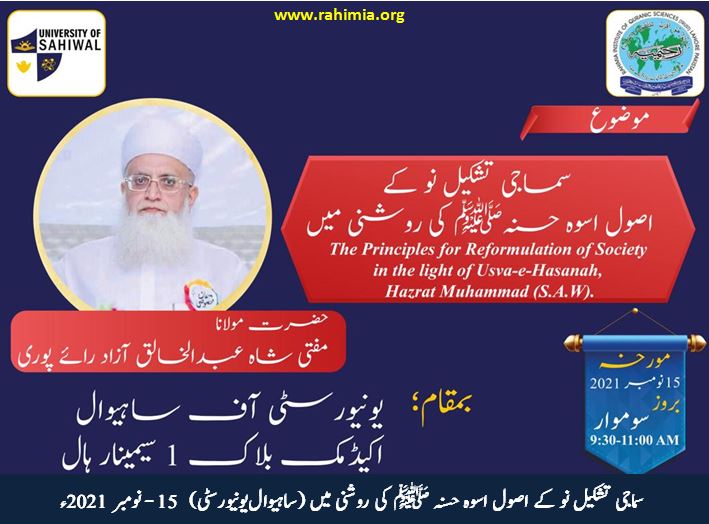 حضرت اقدس مفتی شاہ عبدالخالق آزاد رائے پوری نے فرمایا،"رسول اللہ ﷺ کی سیرت انسانیت کے اجتماعی مسائل کے حل کے لئے اعلی ترین نمونہ ہے۔اس بات کو سمجھنا نوجوانوں کے لئے وقت کی اہم ترین ضرورت ہے۔کسی بھی اجتماع کو پرکھنے کے چار اصول (قومی آزادی،عدل اجتماعی، معاشی خوشحالی، سیاسی امن) ہوتے ہیں.